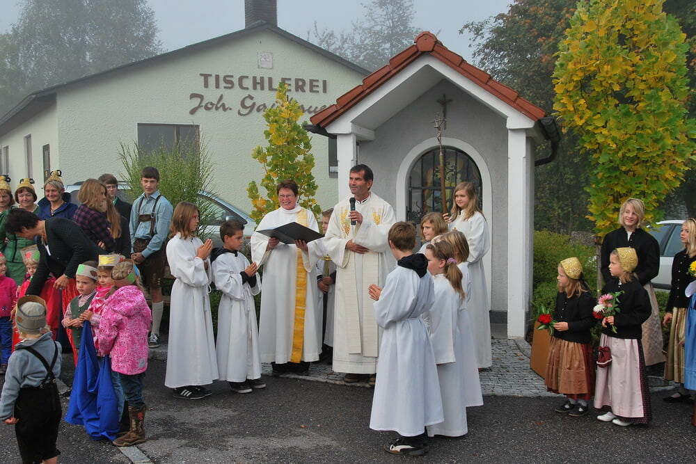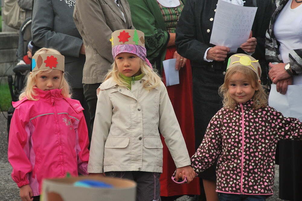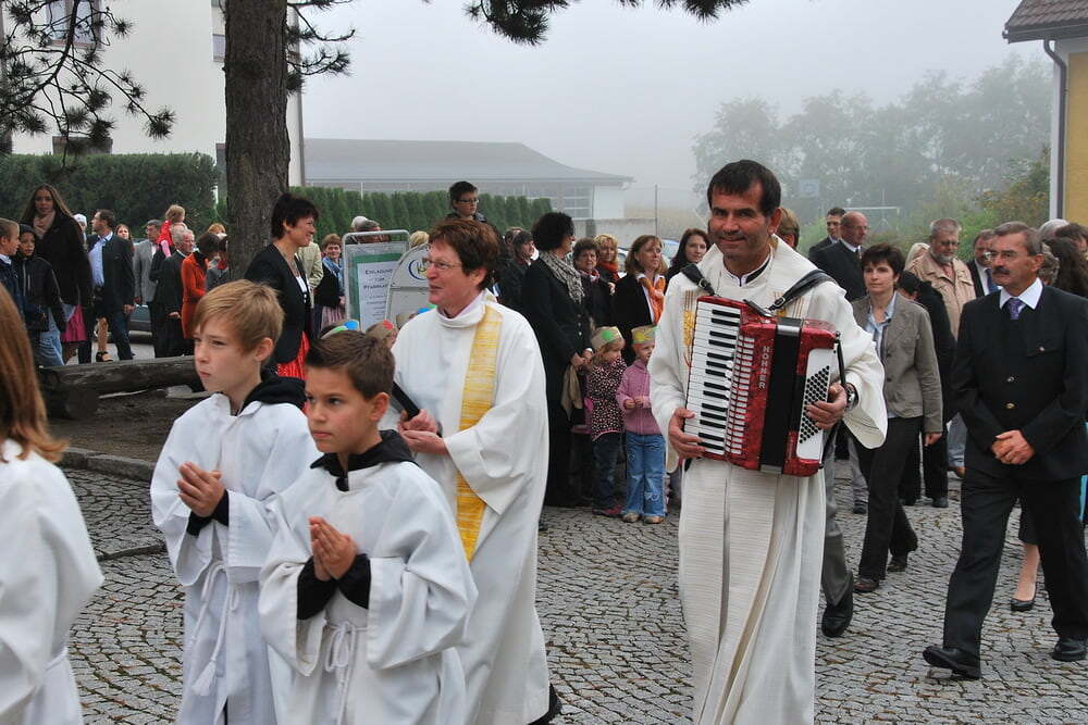 Den Auftakt zum eigentlichen Fest machten die Lieder der Kindergartenkinder, die mit ihrer Fröhlichkeit und ihren Liedern die Zuhörer ansteckten. Pfarrer Bell begrüßte die Anwesenden, unter ihnen auch unseren Bürgermeister und Vizebürgermeister - und dankte dafür, dass in Lacken viele Menschen beisammen sind, damit Leben gelingt - und dass in vielen Vereinen, aber auch in den Familien, viel Liebe weitergeschenkt wird - Liebe, die zuerst ein Geschenk Gottes ist. Musikkapelle, Kirchenchor und nicht zuletzt Pfarrer Bell mit seiner Ziehharmonika „Lisa“ sorgten auch musikalisch für dankbare Stimmung.