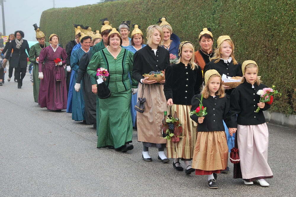 Die stattliche Erntekrone und die Geschenke der Natur waren von der Kopftuch- und Goldhaubengruppe wiederum mit großem Können und Kreativität hergestellt und vor der Ortskapelle aufgestellt worden.
