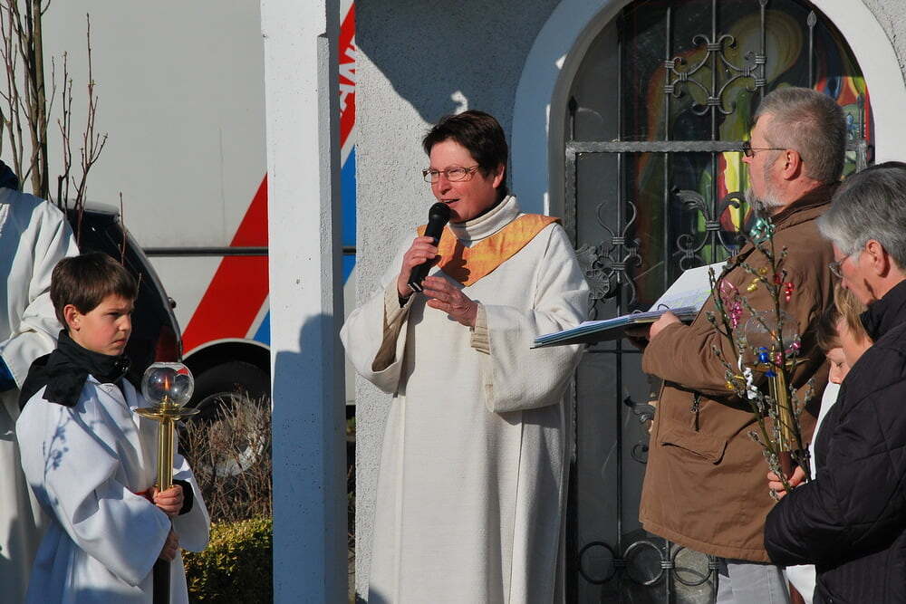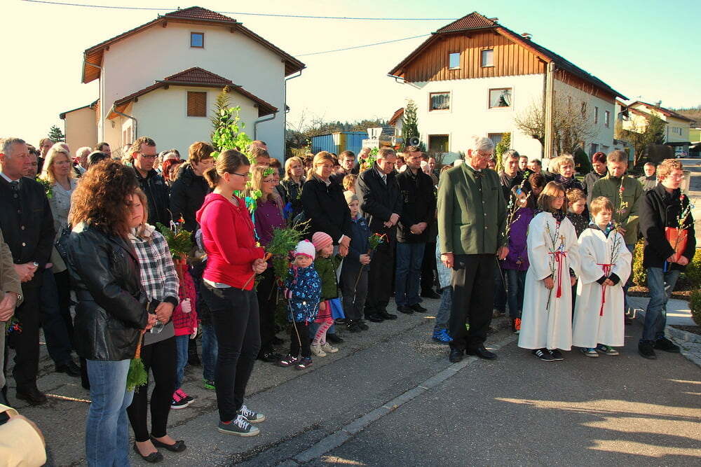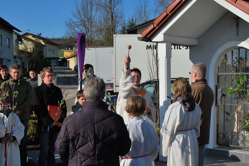 Heuer gelang es erstmals, dass wirklich alle nach dem klingenden Einmarsch der Musikkapelle rund um die Ortskapelle nahe zusammenrückten. Nachdem die Palmbuschen gesegnet worden waren, schwangen Kinder und Erwachsene zum Lied: „Hoch, hoch hosianna, Jesus unser König kommt, hoch, hoch hosianna, Jesus ist von Gott“ die Palmwedel - zwar noch ein bisschen schüchtern, denn das war neu an der Gestaltung, aber die Jubelstimmung, über die das Evangelium berichtete, wurde doch ein bisschen spürbar. Nach dem Rückmarsch in die Kirche, den wieder unsere Musikkapelle verschönte, saßen und standen die Mitfeiernden eng gedrängt beieinander und erwarteten die Fortsetzung der Feier. Sissy Strigl, die Leiterin der Wortgottesfeier, bat uns, vor der Verlesung der Leidensgeschichte nochmals gemeinsam zuerst das „Hosianna“ und dann das „Kreuzige ihn“ zu rufen - damit alle spüren konnten, wie eng diese beiden Aussagen an diesem Sonntag zusammenprallen.