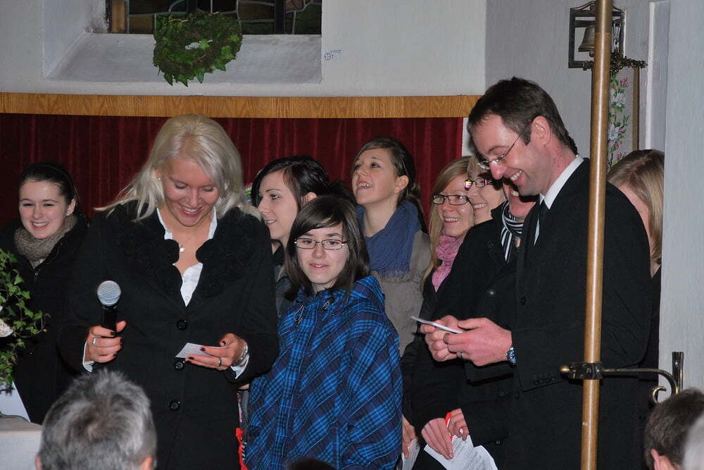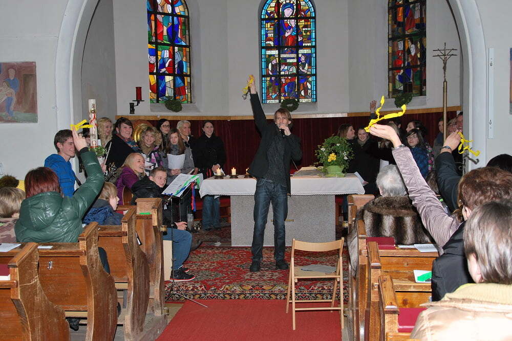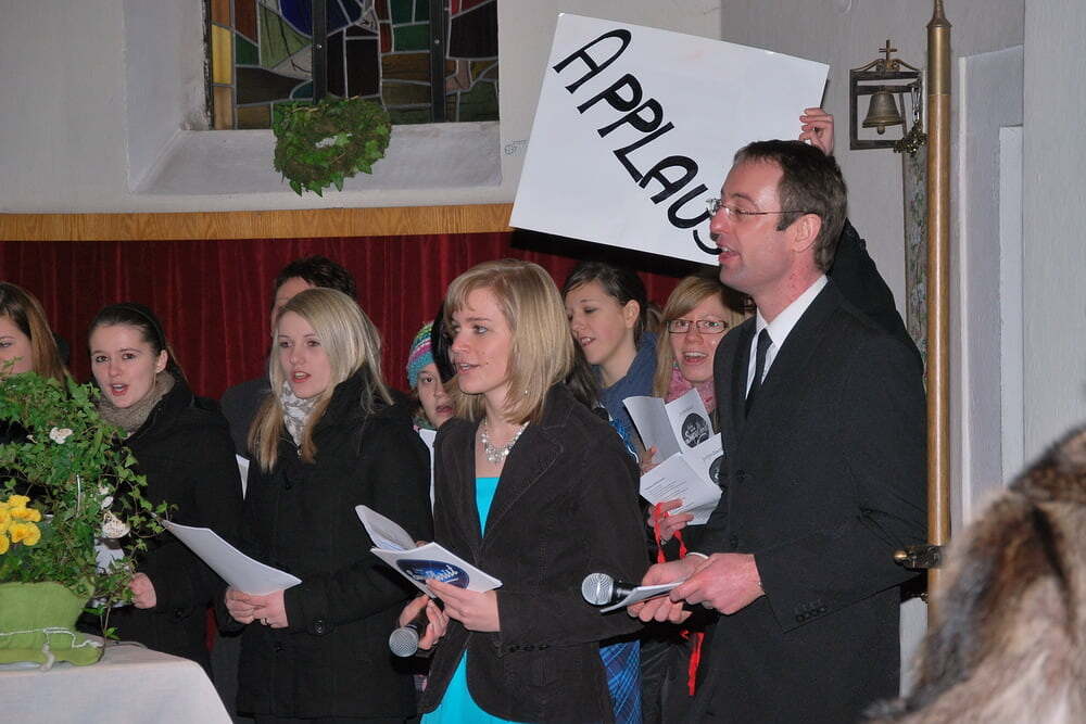 Bevor die Fernsehkameras zugeschaltet wurden, probten die Anwesenden zuerst unter der Anleitung des Sendeleiters Reini Fischer, bei Aufscheinen der Tafel „Applaus“ kräftig zu applaudieren und begeistert für seine Favoriten das jeweilig passende färbige Bändchen zu schwingen (noch waren nicht alle Ohren/Gehirne warmgelaufen, sodass so mancher nicht checkte, wessen Anhänger er später sein sollte). Außergewöhnlich gut funktionierten die Täfelchen „Stille“ und „Amen“ - angeblich überlegt Pfarrer Bell, sie in Zukunft in die Gottesdienste einzubauen.