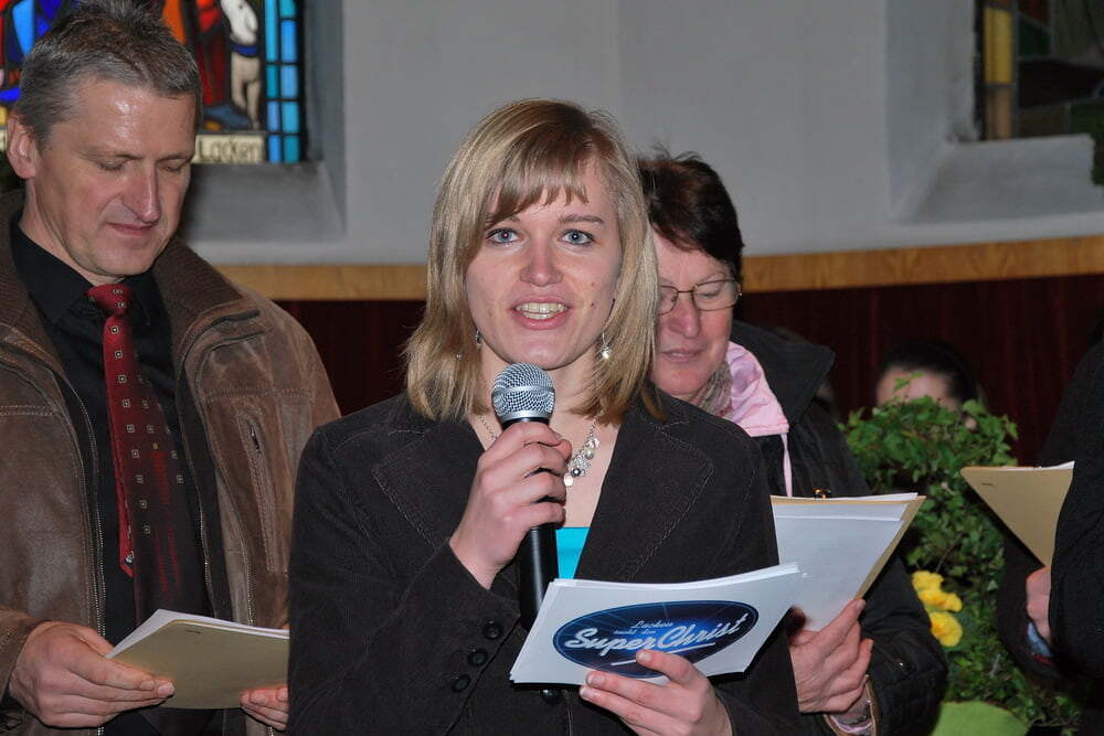 Gaby Mahringer überzeugte mit ihrer Fröhlichkeit und positiven Ausstrahlung - jahrelange Jungschararbeit macht hübsch - und mit ihrem Lied, bei dem spontan alle gerne mitmachten (du hättest uns nicht drohen müssen, Gaby!!) und mit dem sie bei jeder Show DJ Ötzi unter den Tisch gesungen hätte. Sonja Scheinmayr konnte zusätzlich zu ihrem guten Aussehen auch Bibelwissen beweisen - nicht umsonst ist sie eine unserer beliebtesten LektorInnen - und definierte den Superchrist anhand der Bibel** so, dass man glaubte, den „echten“ Paulus reden zu hören. Sandra Gastinger, die nächste Kandidatin, konnte gleich live vor der Kamera zeigen, was sie als Sozialpädagogin bewirken kann: Es gelang ihr, zwei kleine Streithähne zu trennen und sie konnte zur Versöhnung beitragen - eine überzeugende Performance, fand die Jury. Der vierte Kandidat war schon im Vorfeld als Favorit gehandelt worden: Pfarrer Reinhard Bell. Feig ist er nicht, denn sein Beitrag gehört normalerweise nicht zu den „The-winner-is“-Themen: Er stellte das Beichten - jenes Sakrament, das derzeit nicht gerade das gefragteste ist - in den Mittelpunkt seiner Show. Beichten kann auch ein Pfarrer nicht allein, und so wählte er Reini Fischer als jenen aus, der eine Beichte am nötigsten hat.***) Man ließ den beiden viel Zeit, in der Sakristei zu beichten - währenddessen schaltet die Sendeleitung zu den Werbeeinschaltungen