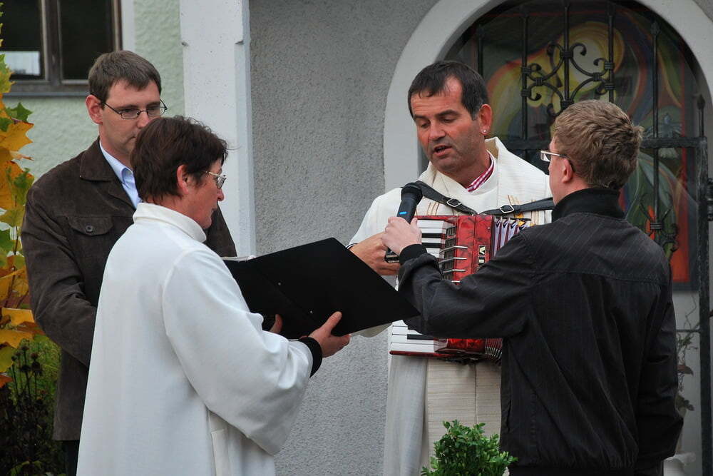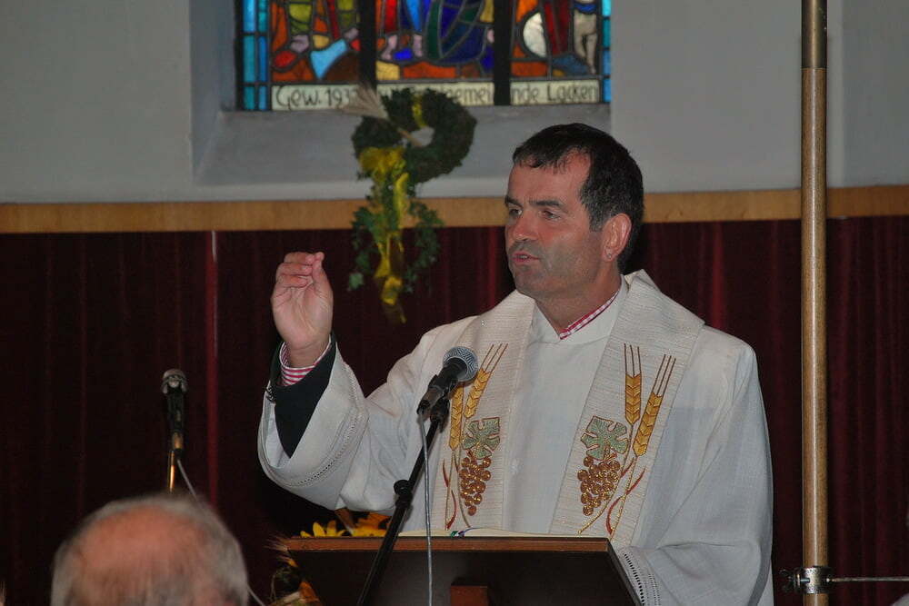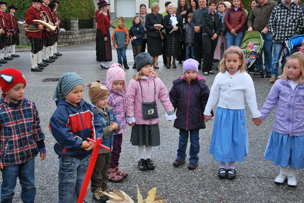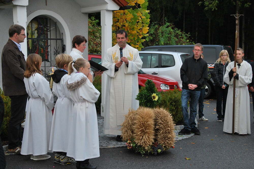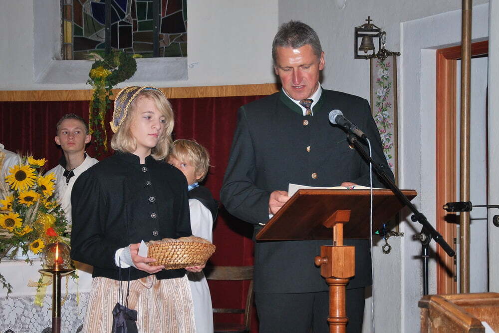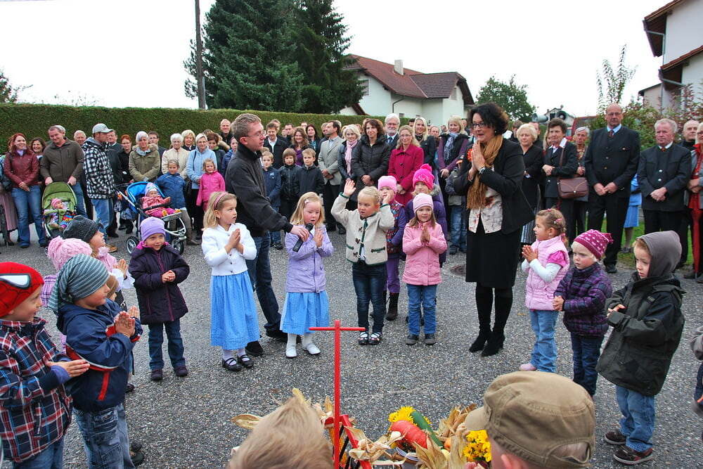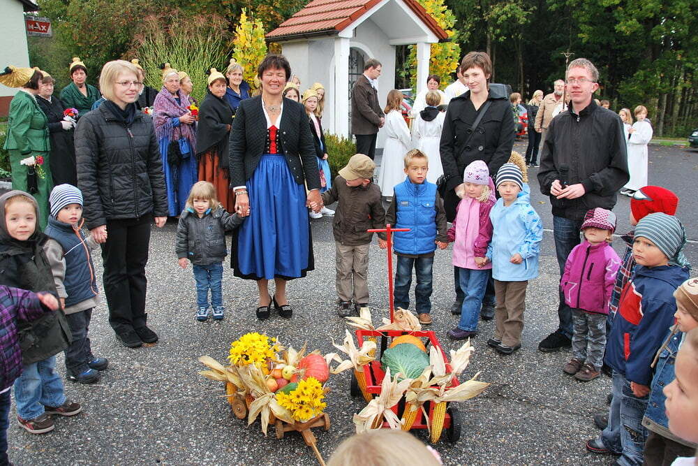 (Wieviel war schon im Vorfeld geprobt, organisiert und gemeinsam vereinbart worden!). Den Auftakt zum eigentlichen Fest machten die Lieder der Kindergartenkinder, die in ihrer Einfachheit den Kern trafen: „Alle guten Gaben, alles was wir haben, kommt oh Herr von Dir.“ Pfarrer Bell begrüßte die Anwesenden, unter ihnen auch unseren Bürgermeister - und dankte dafür, dass in Lacken viele Menschen beisammen sind, damit Leben gelingt - und dass in vielen Vereinen, aber auch in den Familien, viel Liebe weitergeschenkt wird - Liebe, die zuerst ein Geschenk Gottes ist.