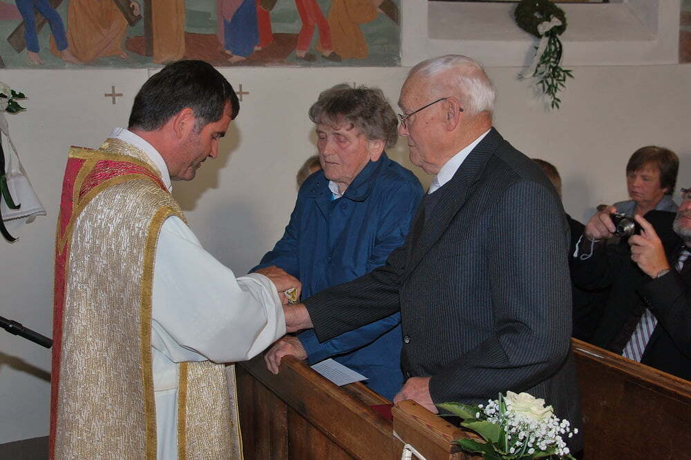 Die Jubelpaare zogen, begleitet vom Musikverein Lacken (diesmal ohne Bierflaschen), der Trachtengruppe, den Ministranten, Pfarrer Reinhard Bell und Wortgottesfeier-Leiterin Sissy Strigl im Festzug von der Ortskapelle zur Kirche. Beim Einzug war die Kirche noch elektrisch beleuchtet, doch bei Beginn des Gottesdienstes versetzte ein ortsweiter Stromausfall die Gottesdienstteilnehmer in jene romantischen Zeiten zurück, als Messfeiern nur bei Kerzenschein und ohne Mikrofone gefeiert wurden. Aber in Lacken lässt man sich durch so etwas nicht irritieren: Die Musikkapelle spielte „Ich bete an die Macht der Liebe“ auch ohne Licht, ein Text übers Miteinander-Unterwegs-Sein war auch ohne Mikrofone gut verständlich und Pfarrer Bell lässt sich ohnehin durch solche Kleinigkeiten nicht aus dem Konzept bringen. Bald war der Strom wieder da, und Lesungen und Predigt wurden wieder von Mikrofonen unterstützt. In der Predigt betonte Pfarrer Bell, dass ein Eheversprechen - Liebe - Verlässlichkeit und Treue - für ein ganzes Leben gilt, so wie auch Gottes Liebe für uns - dazu erzählte er viel Bewegendes aus der Beziehung seiner Eltern zueinander. Wie im heutigen Evangelium, wo erzählt wird, dass in einem Feld neben dem Getreide auch das Unkraut wächst, reißt Gott nicht an uns herum, damit wir endlich ohne Fehler sind. Und genauso sollten wir als Paare nicht auseinanderlaufen, wenn wir das Unkraut beim anderen sehen. Nach der Predigt erneuerten die Jubelpaare ihr Eheversprechen, ihre Kerzen wurden an der Osterkerze entzündet und jedes einzelne Paar empfing Gottes Segen. Ganz besonders herzlich mit eingeschlossen in die Gedanken aller waren auch jene, die nicht persönlich bei der Feier in der Kirche dabei sein konnten.