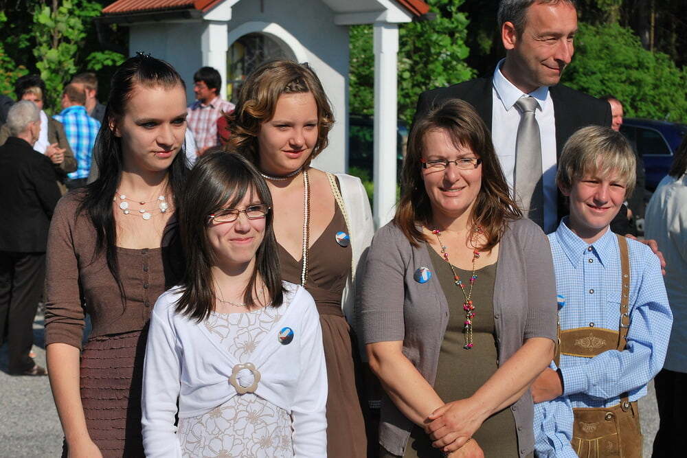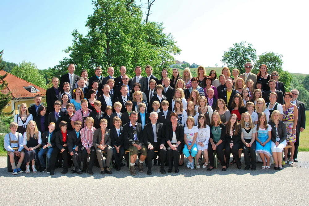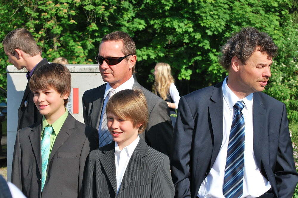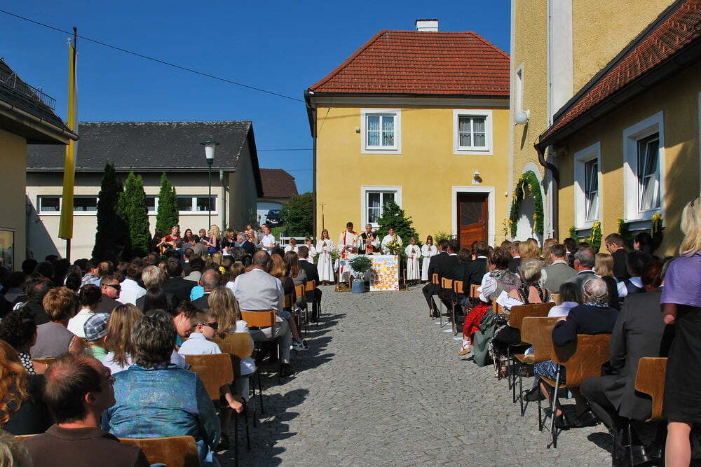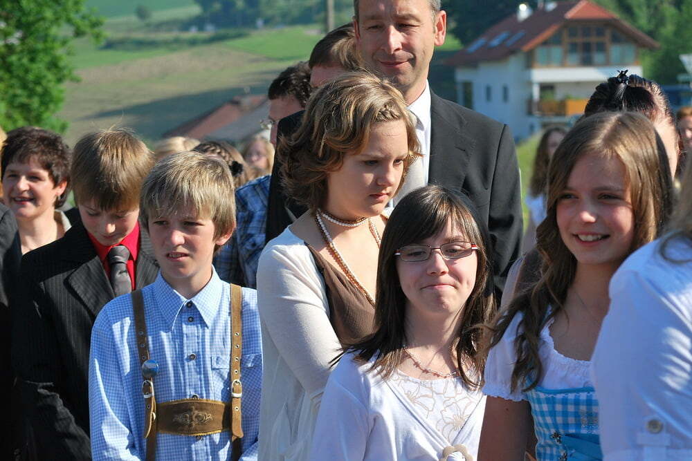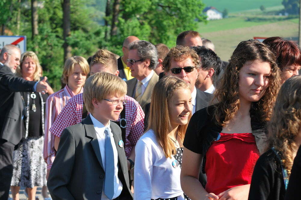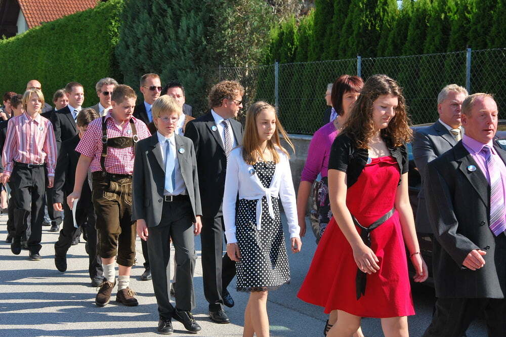 Und es war wirklich ein frühsommerlicher Morgen, an dem sich die Firmlinge mit Paten, Eltern und Großeltern bei der Ortskapelle versammelten. Bald stellte sich heraus, dass Sakkoträger eindeutig benachteiligt waren, weil die Sonne von Minute zu Minute kräftiger schien. Zum Einzug wurden sie vom gut gelaunten Pfarrer Bell, Sissy Strigl und dem Firmspender abgeholt. Die Blasmusik sorgte dafür, dass die Stimmung umgehend von „lang Herumstehen und Warten“ auf „Vorfreude“ umschlug.