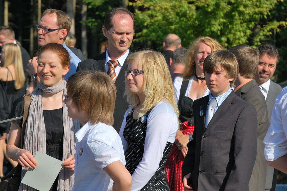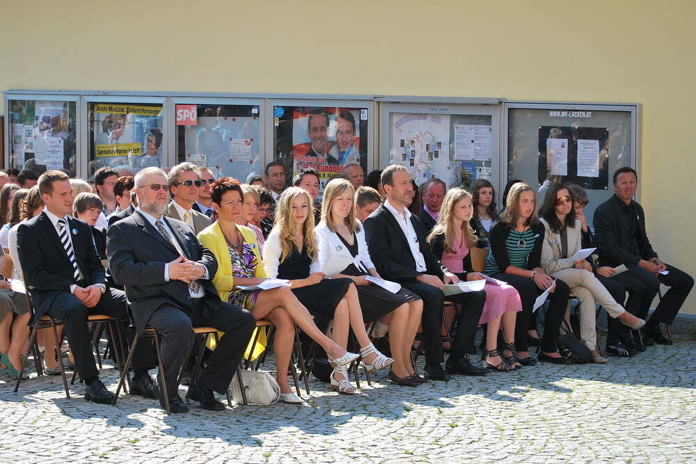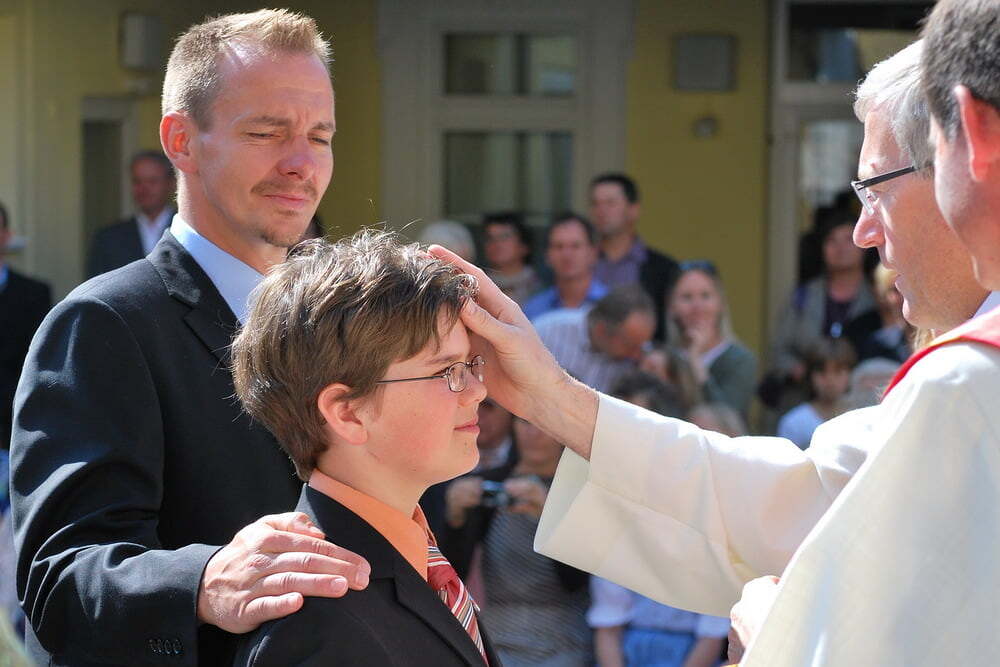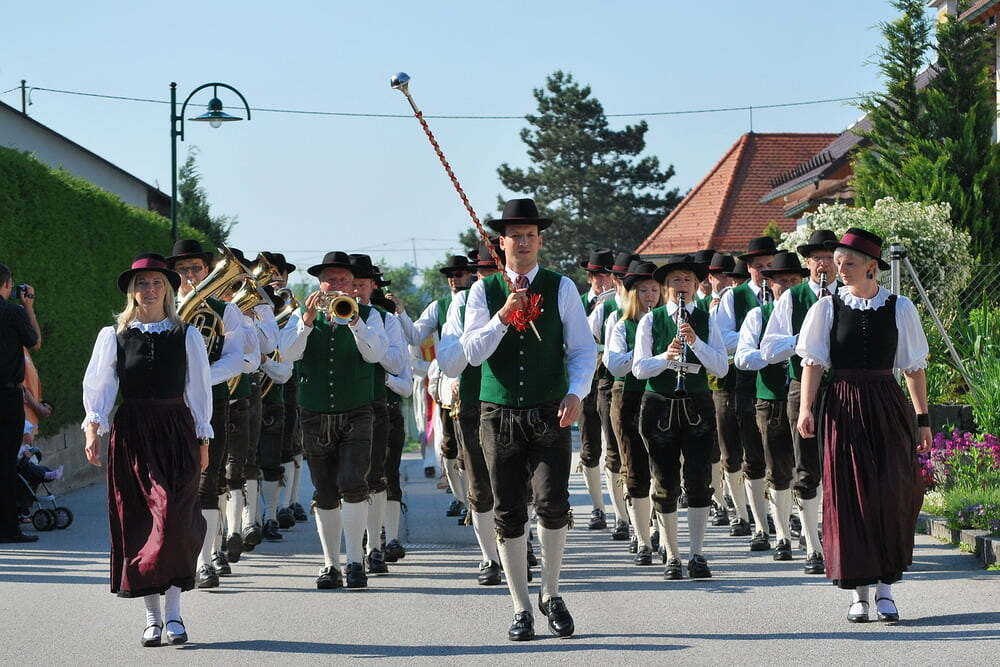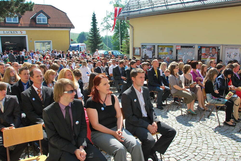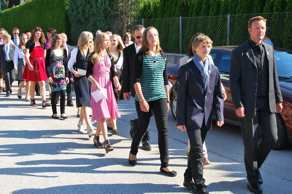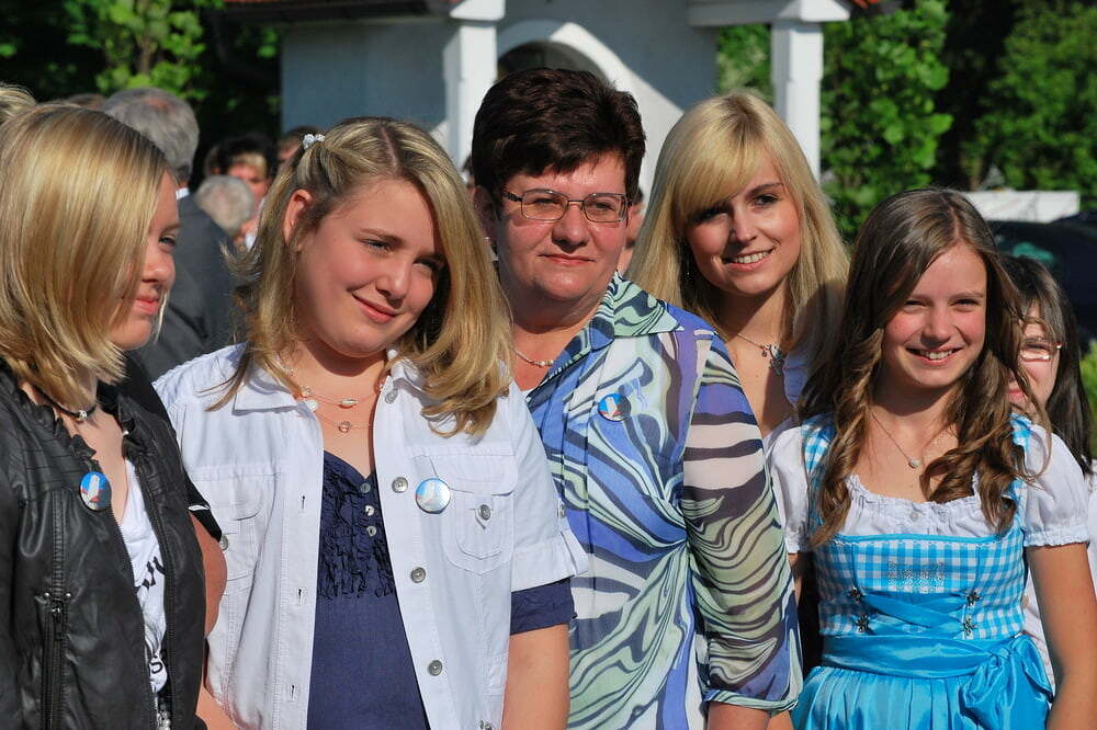 Und es war wirklich ein frühsommerlicher Morgen, an dem sich die Firmlinge mit Paten, Eltern und Großeltern bei der Ortskapelle versammelten. Bald stellte sich heraus, dass Sakkoträger eindeutig benachteiligt waren, weil die Sonne von Minute zu Minute kräftiger schien. Zum Einzug wurden sie vom gut gelaunten Pfarrer Bell, Sissy Strigl und dem Firmspender abgeholt. Die Blasmusik sorgte dafür, dass die Stimmung umgehend von „lang Herumstehen und Warten“ auf „Vorfreude“ umschlug.