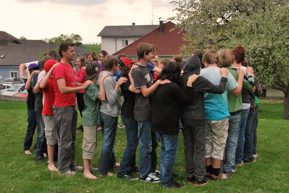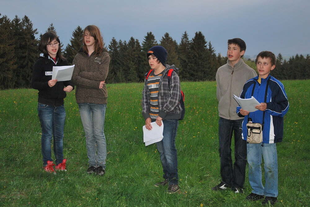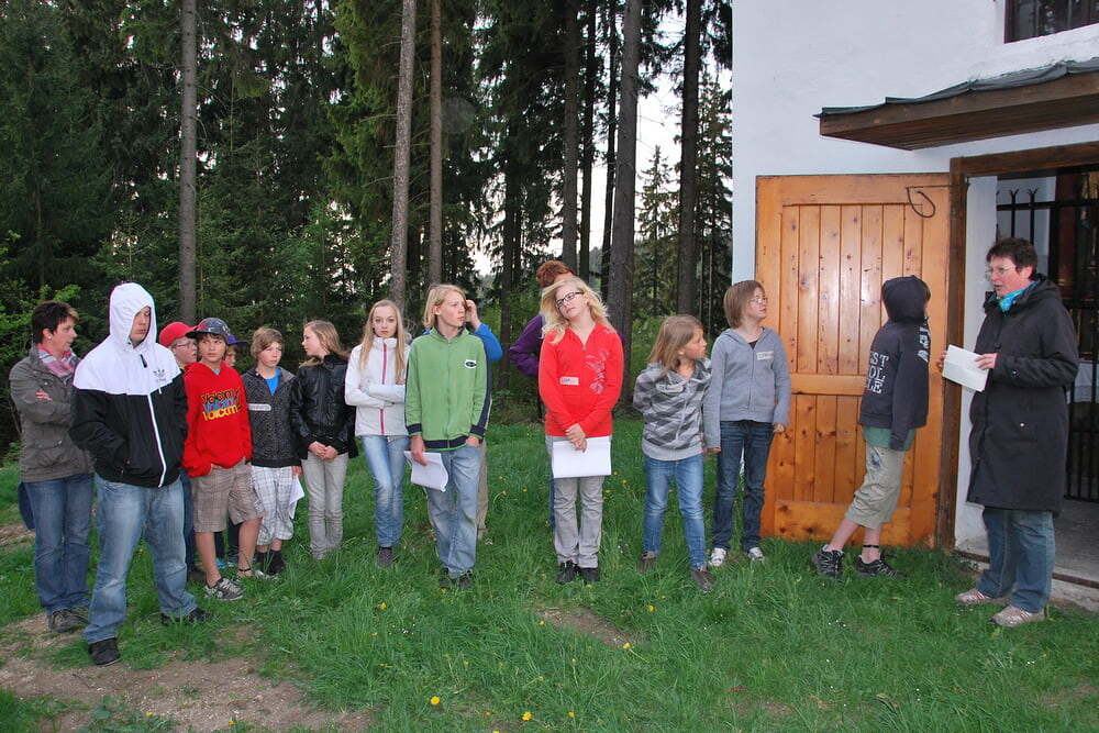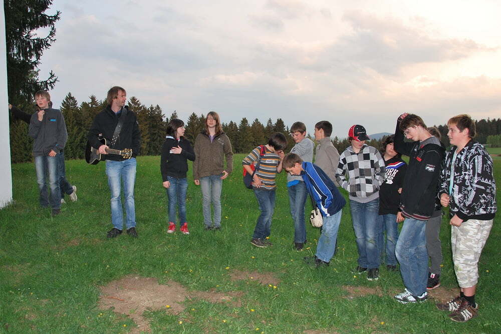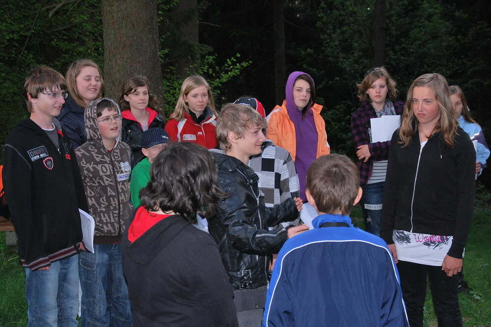 Nach einer kurzen Stärkung und der Erklärung des weiteren Ablaufs lernten die Firmlinge, wie man sich bei einer Bushaltestelle auch ohne Bank niedersetzen kann. Anschließend wurde St. Johann durch markerschütternde Schreie aus der nachmittäglichen Ruhe gerissen. Die mittlere von drei Gruppen musste versuchen, so laut zu schreien, dass die linke Gruppe nicht verstehen konnte, welchen Begriff ihr die rechte Gruppe zurufen wollte. Und zur Auflockerung gab es noch ein Jump-and-run-Spiel, diesmal aber nicht auf dem Computer. Zur Vorbereitung des Abendlobs teilten sich die Firmlinge in drei Gruppen: Gruppe 1 erarbeitete mit Sissy Striegl und Anni Bumberger ein Bibliorama mit der pantomimischen Darstellung des Sonntagsevangeliums vom ungläubigen Thomas. Gruppe 2 überlegte sich gemeinsam mit Michael Radinger einige Fürbitten und Gruppe 3 probte mit dem Jugendleiter des Dekanats St. Johann, Reini Fischer, und Sandra Bruckner die Lieder - loud is beautiful. Alfred Alberer hatte sich inzwischen ums Lagerfeuer gekümmert, sodass nach den Vorbereitungen unverzüglich zum abendlichen Grillen übergegangen werden konnte. Witterungsbedingt musste die geplante Wanderung auf den Hansberg stark gekürzt werden, wodurch zum Leidwesen aller auch der Fackelzug entfiel. Bei einer Kapelle wurde das Abendlob gefeiert, wo auch die vorbereiteten Lieder gesungen wurden, das Bibliorama aufgeführt wurde und die Fürbitten vorgetragen wurden. Nach der Rückkehr ins Quartier beschäftigten sich einige Firmlinge still (was man bei Firmlingen halt so unter still versteht) und einige sangen noch gemeinsam mit Reini und Sandra aktuelle Lieder, aber auch alte ‚Hadern’ (‚Country roads, take me home’, ‚Meine Oma fährt im Hühnerstall Motorrad’, ...). Die geplante Nachtruhe um 23 Uhr 30 war mehr ein frommer Wunsch als Realität. Gegen halb fünf Uhr morgens war es dann endlich ruhig und so kamen auch die Mitglieder des Firmteams noch zu eineinhalb Stunden Schlaf.