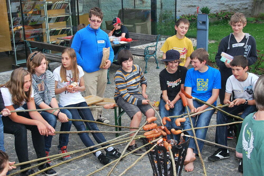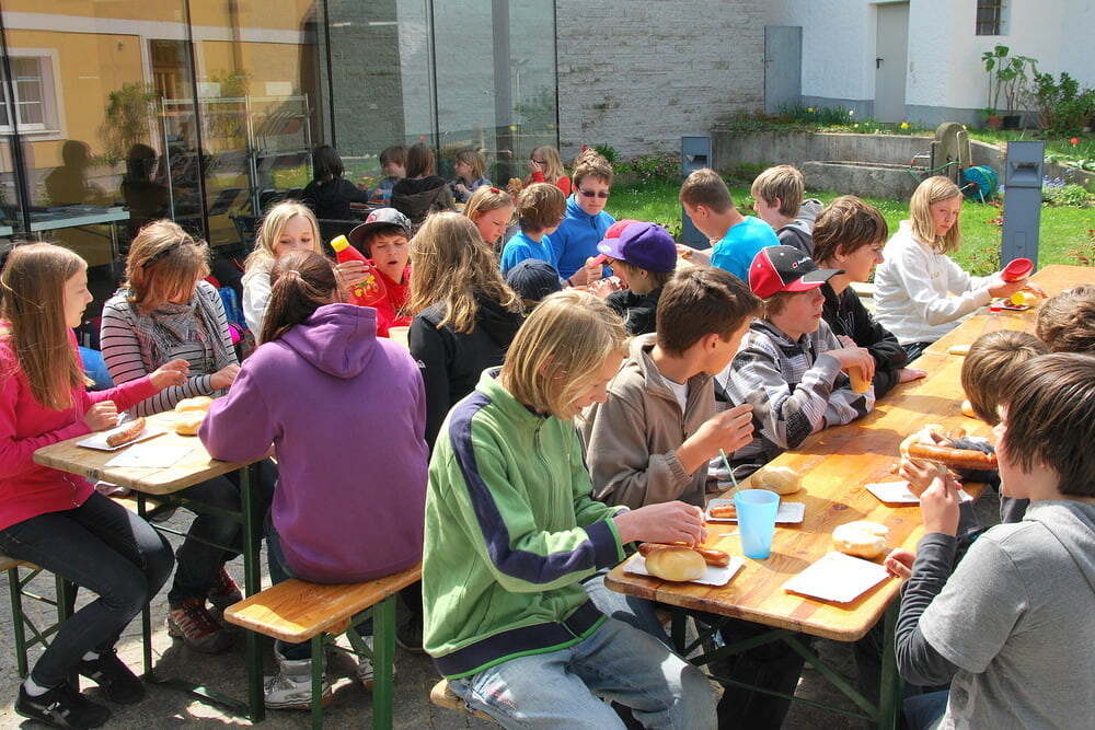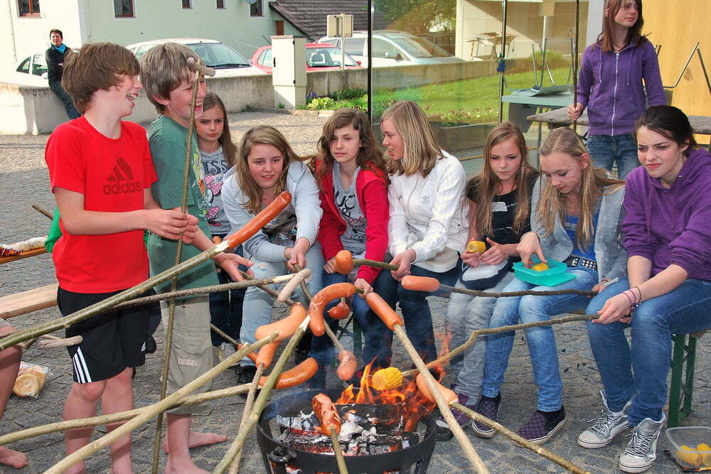 Nach einer kurzen ‚Feedback-Session’ und der Mitteilung, dass die Firmlinge bei ihrer Schuhputzaktion am Ostermontag über 400 Euro erputzt hatten (dieser Betrag reicht aus, um ca. 70 Kindern die Schulmaterialien für ein Jahr zur Verfügung zu stellen - eine Superleistung!!) gab es Punkt 12 Uhr Mittagessen in Form von Käsekrainern und Bratwürsteln.