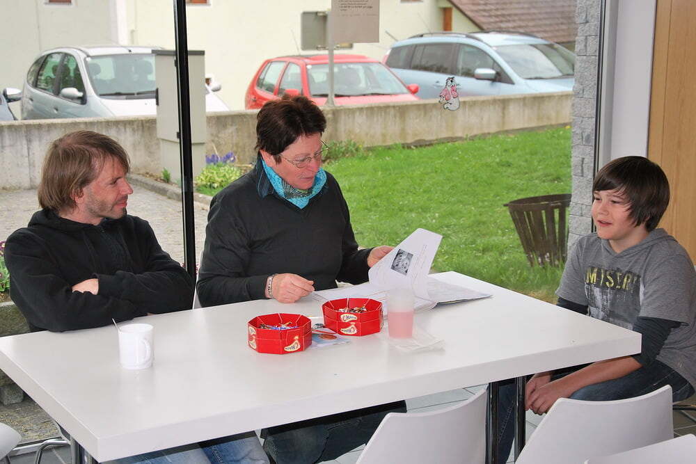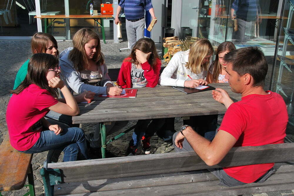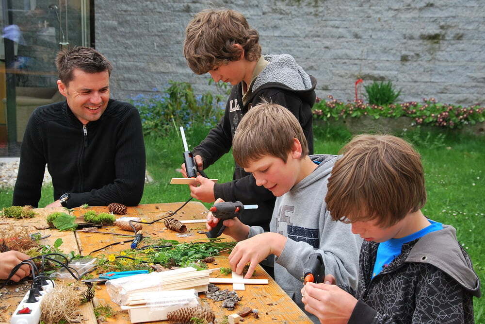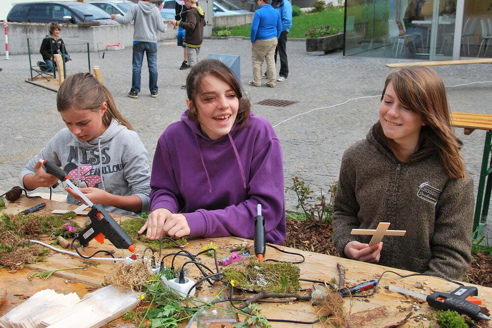 Nach dem Frühstück und der Aufnahme eines Gruppenfotos folgte eine kurze Wanderung, um Materialien für das anschließende Basteln eines Kreuzes zu sammeln. Nach der Rückkehr teilten sich die Firmlinge wieder in drei Gruppen: während die einen unter Anleitung von Alfred Alberer die Ansteckknöpfe für die Firmlinge und deren Paten produzierten, die zweite Gruppe mit Sandra Bruckner und Michael Radinger Kreuze bastelte, führte Sissy Strigl gemeinsam mit Reini Fischer das persönliche Gespräch mit jedem einzelnen Firmling, wobei auch die Firm-Hefte kontrolliert wurden. Für jene, die in ihrer Gruppe schon fertig waren und noch warten mussten, gab es bei Anni Bumberger eine Spielstation.