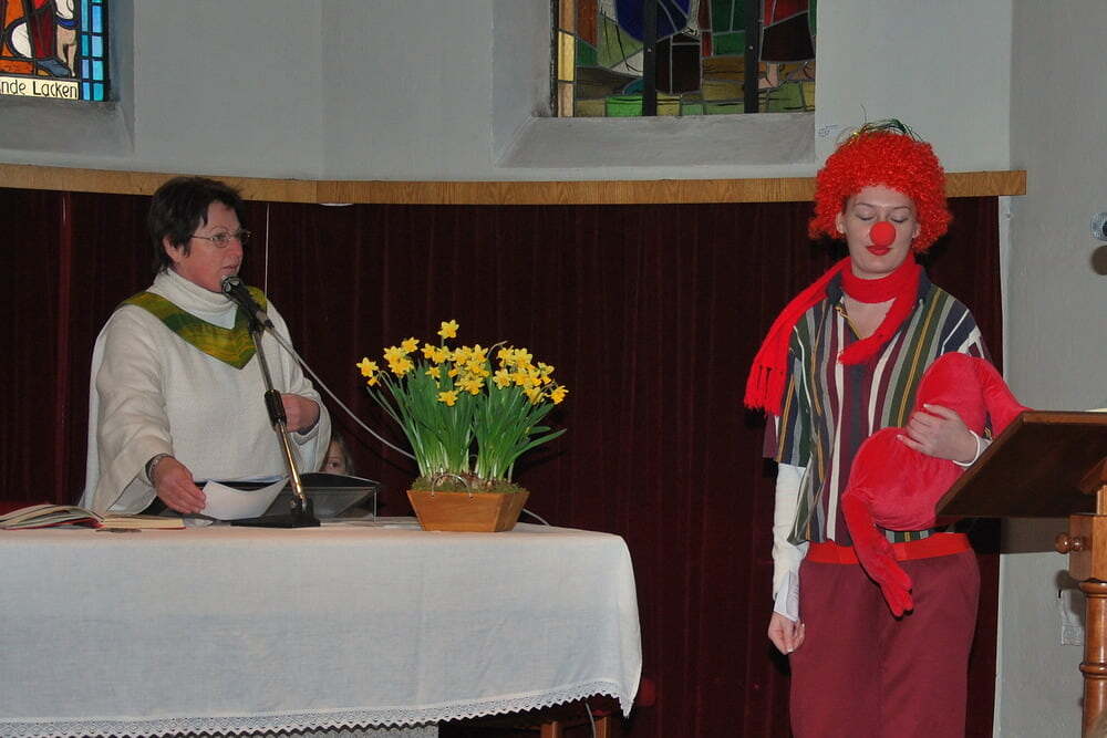 Wie Freude und Gottesdienst zusammenpassen, hat zu Beginn der Wortgottes-Feier der Clown unserer Sissy Strigl erklärt: Das Besondere an Jesus ist sein großes Herz für alle Menschen. Und auch alle Menschen, die fröhlich sind und einander Freude bereiten, haben ein großes Herz.