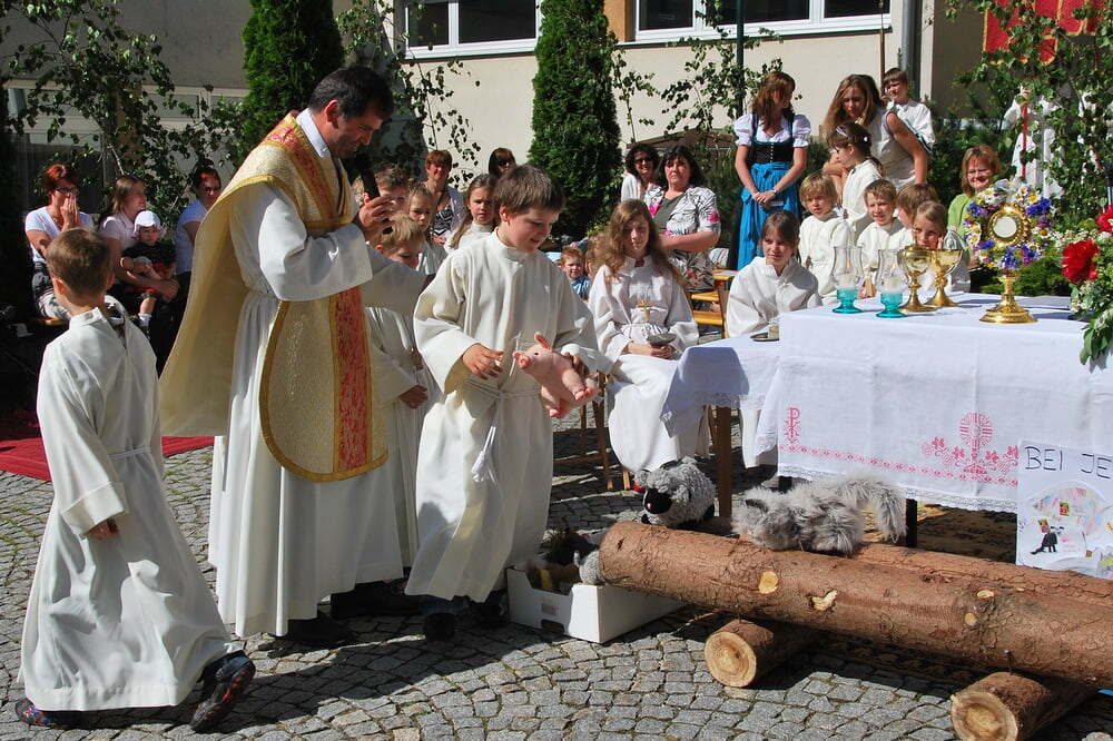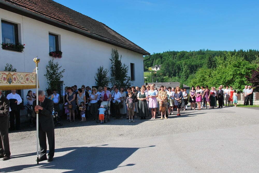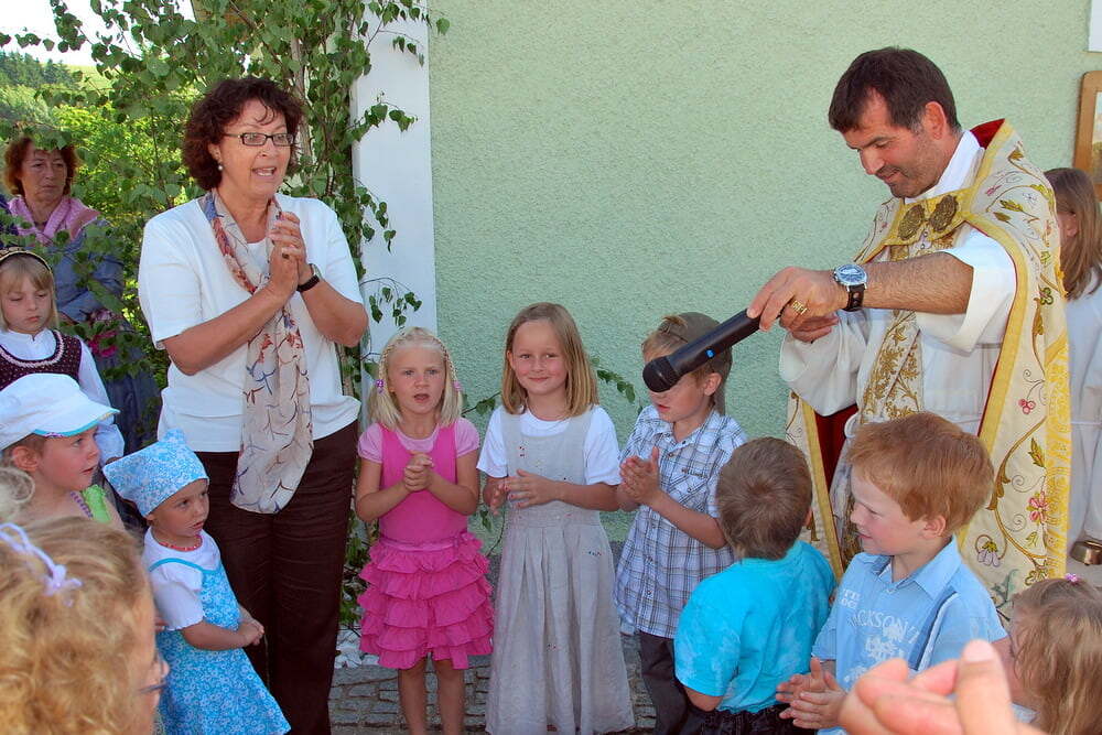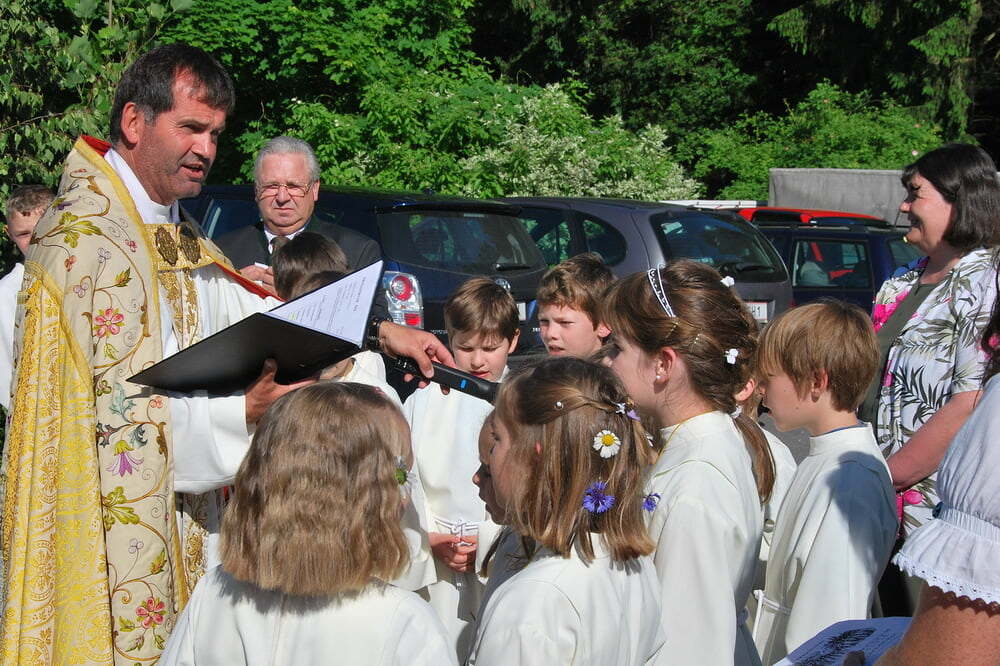 Herzeigen, was uns Kraft gibt, sagen, welche Werte für uns zählen. Dazu gehört das Gegrüßet-seist-du-Maria-Beten beim Umzug genauso wie die fröhlichen Lieder der Erstkommunionkinder und der Kindergarten- und Spielgruppenkinder bei den Altären. Pfarrer Bell erklärte anschaulich, was jeder weiß, aber erfolgreich verdrängt: Dass unser Leben selbst bei gesündester Ernährung irgendwann endet, und dass Jesus das Brot für uns geworden ist, das für immer da ist.