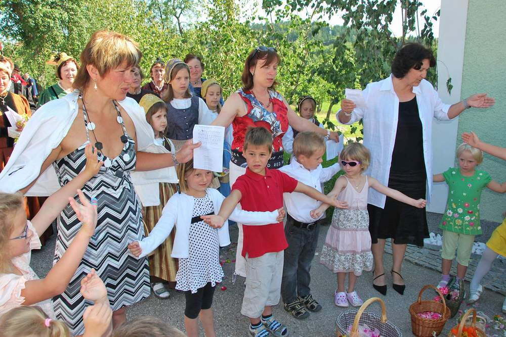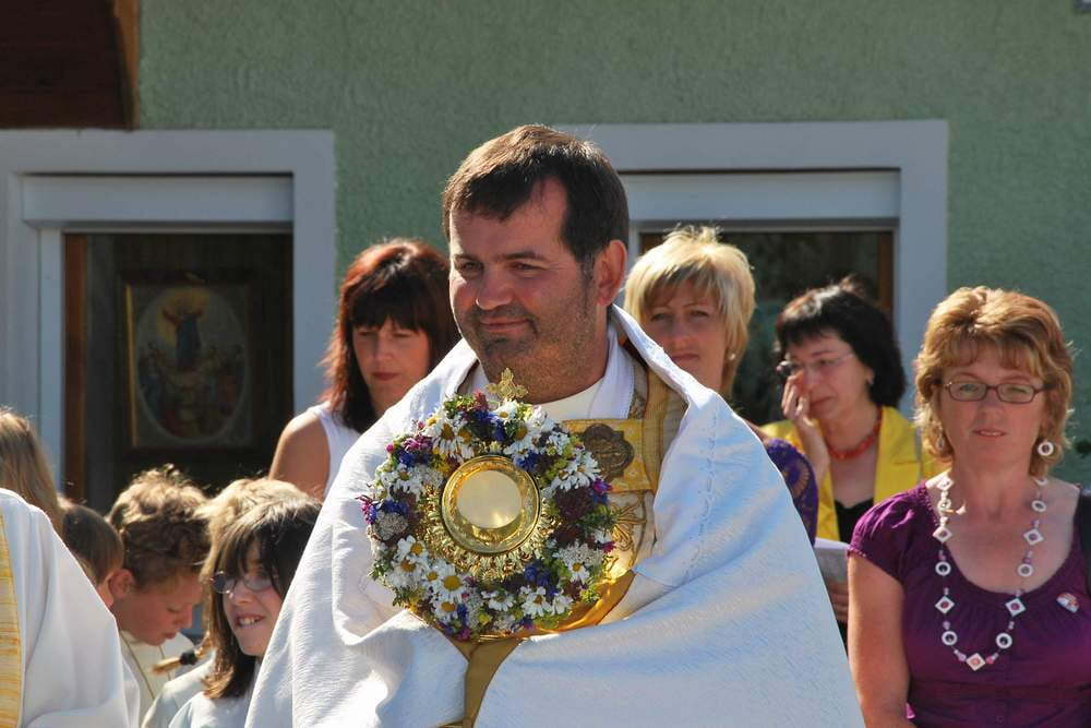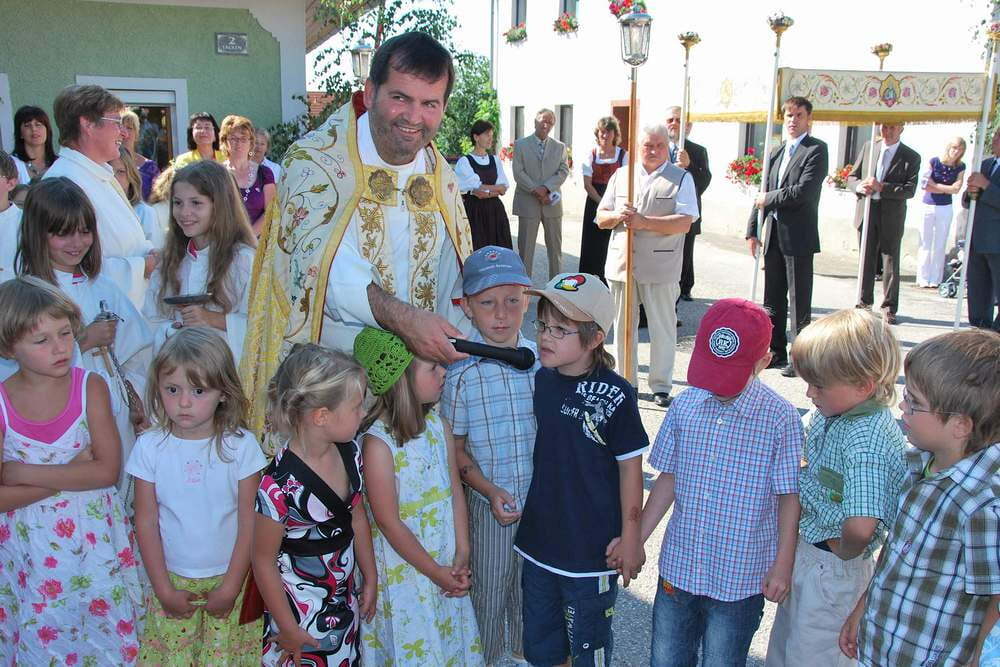 Die schönen Fahnen, die Musiker, Feuerwehrleute und der Kameradschaftsbund in ihren Uniformen, die Goldhaubenfrauen und die Mädchen mit den bestickten Hauben, die liebevoll geschmückten Häuser und Altäre - all dies trug dazu bei, den Grundgedanken des Festes zu spüren: Dass Jesus beim letzten Abendmahl seine bleibende Gegenwart in Brot und Wein verheißen hat und dass wir als Pfarre diese Gegenwart auch in die Öffentlichkeit tragen! Die Kindergartenkinder erfreuten an der zweiten Station mit Liedern, die Erstkommunionkinder durften bei der dritten Station nochmals ihr großes Wissen unter Beweis stellen. Auch viele der kürzlich Gefirmten konnte man bei der Fronleichnamsprozession erblicken!