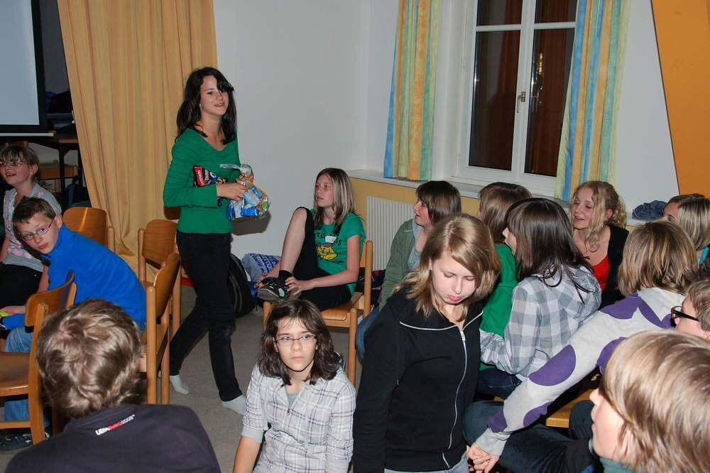 Nach einer kurzen Stärkung mit Saft und Kuchen lernten sich die Firmlinge untereinander beim "Wollknäuel"-Spiel besser kennen. Im Abendprogramm spielte Michael Radinger den Showmaster bei der "Millionenshow". Für jede richtige Antwort durften die Kandidaten ihr Glück an der "Süßigkeiten-Maschine" von Alfred Alberer versuchen. Trafen sie mit dem Ball, kam etwas Süßes retour. Schlussendlich gab es aber nur Gewinner! Spät aber doch schliefen die Firmlinge auch noch ein. Am Morgen wurden die Firmlinge nach dem Morgenlob und dem Frühstück auf 4 Gruppen aufgeteilt: Sissy Strigl führte mit den Firmlingen ein Gespräch und kontrollierte die Hefte, Alfred Alberer produzierte mit den Firmlingen die Sticker für die Firmung, Regina Pichler und Michael Radinger stellten die Geschicklichkeit der Firmlinge auf eine harte Probe und Anni Bumberger betreute die "Kreuzbastler". Zu Mittag gab es dann noch Grillwürstel als Stärkung für den Heimweg.