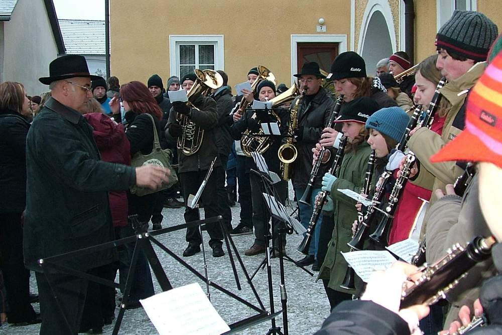 Die JungmusikerInnen von Lacken stimmten, dirigiert von Herrn Mörzinger, auf die Krippenfeier ein und untermalten die Prozession mit dem kleinen Jesuskind zur Krippe musikalisch.