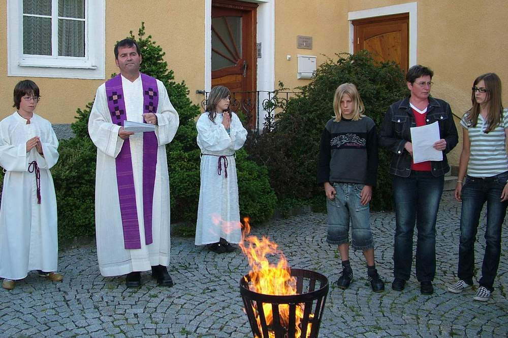 Die Firmkandidaten und -kandidatinnen wurden gebeten, jeder für sich in der Kirche einen Platz zu suchen und dort auf einen Zettel jene Eigenschaften zu schreiben, die sie vom "Feuer des Heiligen Geistes" auflösen lassen möchten. Während Eltern und Paten vor der Kirche für sie beteten, gingen die Jugendlichen mit ungewöhnlichem Ernst ans Schreiben. Anschließend warf jeder seinen Zettel ins bereitgestellte Feuer. Das Wort "'Bußfeier'" erhielt nicht nur für die Firmlinge, sondern auch für Eltern und Paten eine echte Bedeutung.