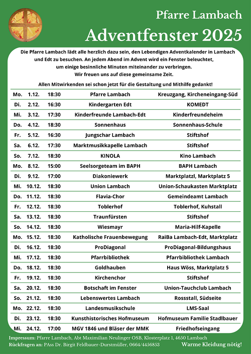 Die Pfarre Lambach lädt alle herzlich dazu sein, den Lebendigen Adventkalender in Lambach und Edt zu besuchen. An jedem Abend im Advent wird ein Fenster beleuchtet, um einige besinnliche Minuten miteinander zu verbringen. Wir freuen uns auf diese gemeinsame Zeit.