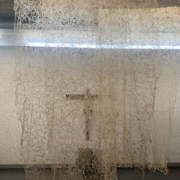 Dafür bietet die "Hiesmayr-Kirche" einen einmaligen Gestaltungsraum. Die Stoffbahnen sind so fein, dass sie sich schon bei leichtem Windzug bewegen. In ihrer Struktur weiche Wellen schlagend, verändert die Installation den Blick auf das Kreuz je nach Position in der Kirche.