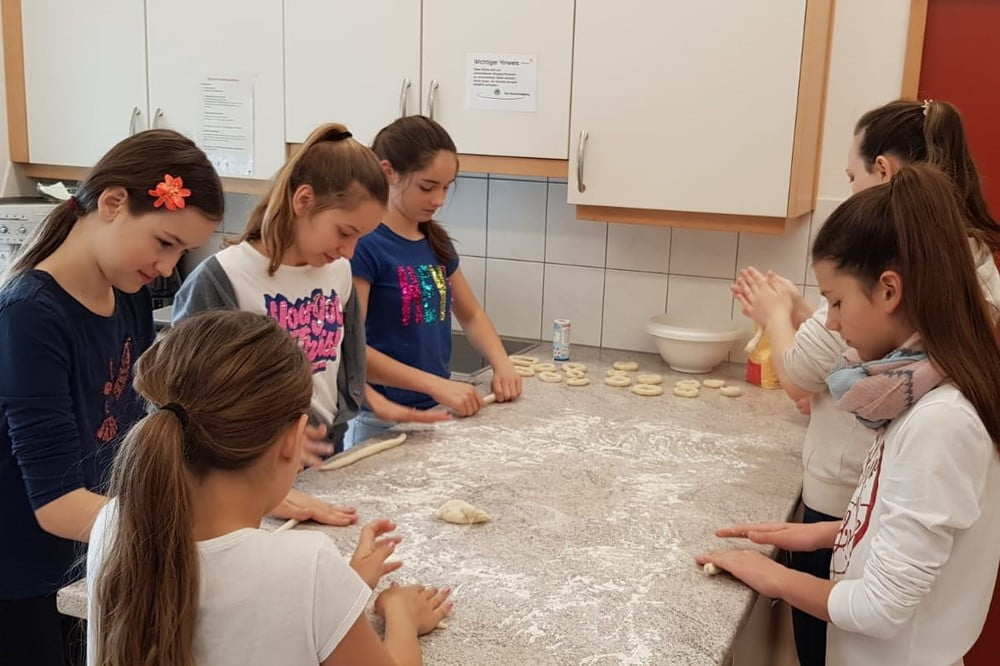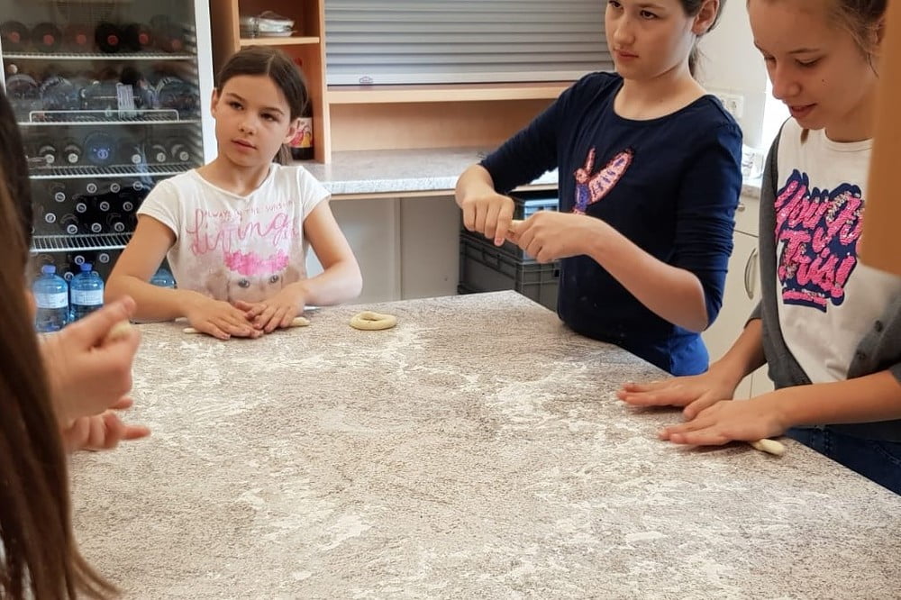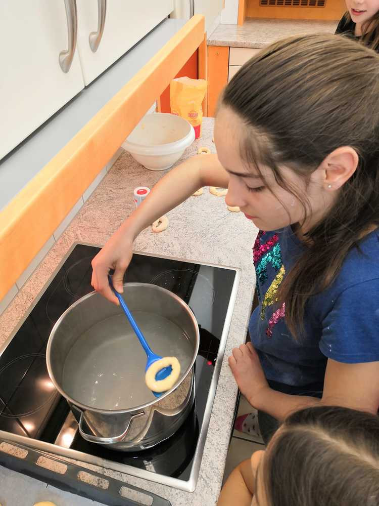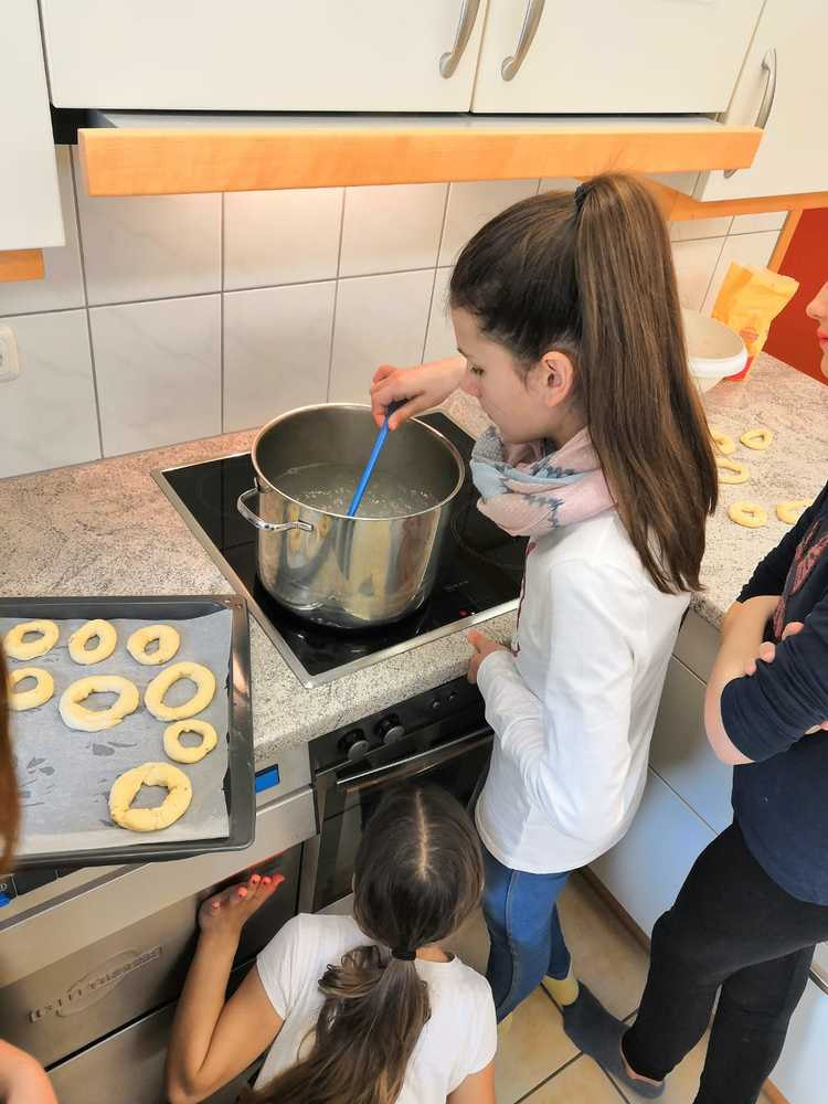 Der Teig dazu kam von Julia Stubauer. Die Kinder konnten daraus Ringe machen, die dann im Salzwasser gekocht werden und schließlich noch gebacken. Das war eine spannende Angelegenheit.
