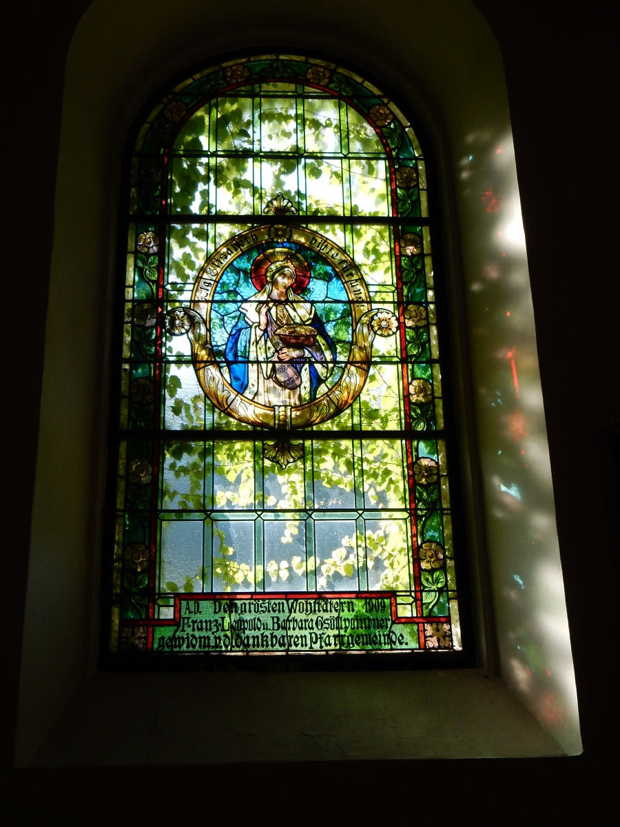 Große Verdienste um diesen Zubau erwarb sich das Ehepaar Gsöllpointner (Klein-Mitterberg) und Bürgermeister Muckenhuber. Diesen Gönnern wurde als Dank ein Kirchenfenster im Kirchenschiff gewidmet.