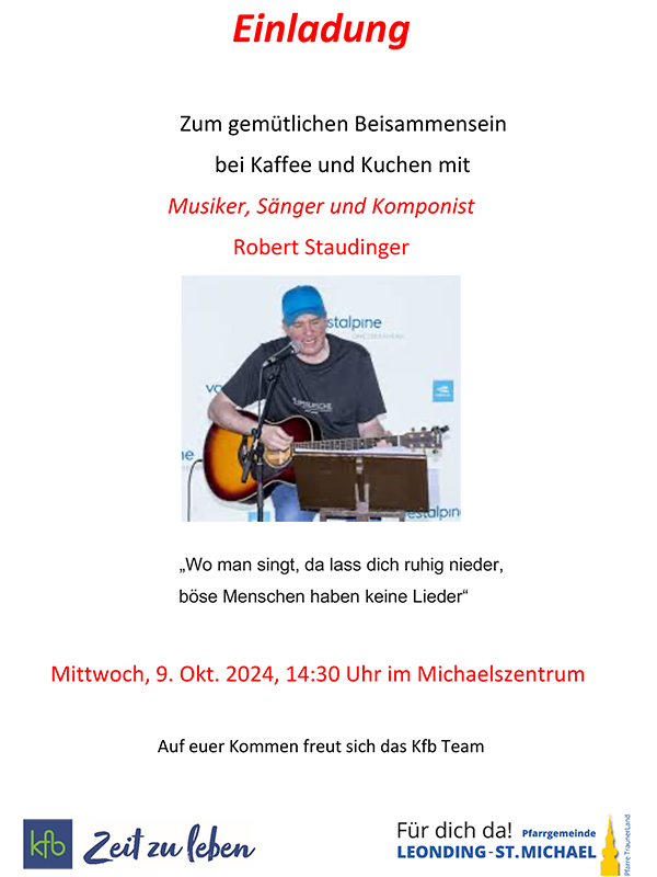 Die kfb lädt herzlich ein zum gemütlichen Beisammensein bei Kaffee und Kuchen mit Musiker, Sänger und Komponist Robert Staudinger