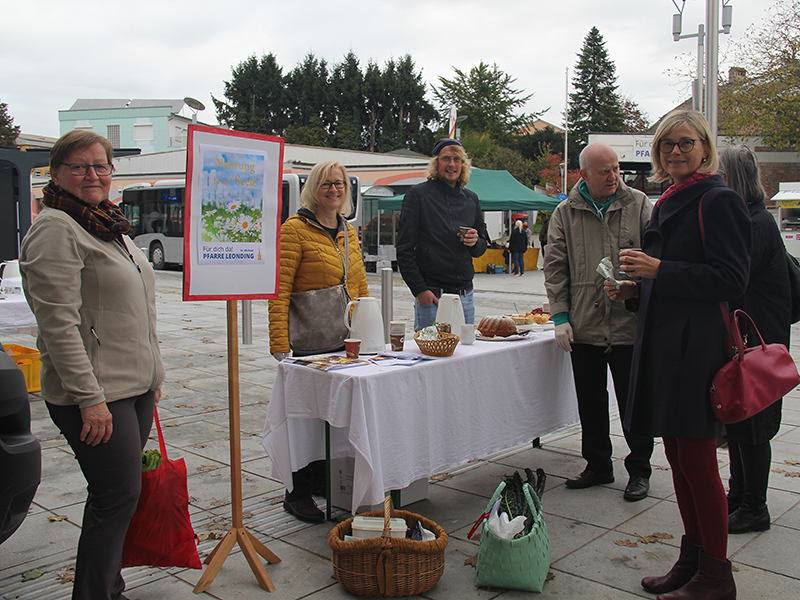 Zu den Marktständen, die fürs leibliche Wohl regionale und saisonale Schmankerl anbieten, gesellte sich am 16. Oktober erstmals ein Stand unserer Pfarre, der zum Gespräch zum Plaudern und Verweilen einlud. Neben Kuchen und Kaffee gab es auch Infos zum Pfarrleben.