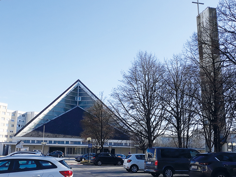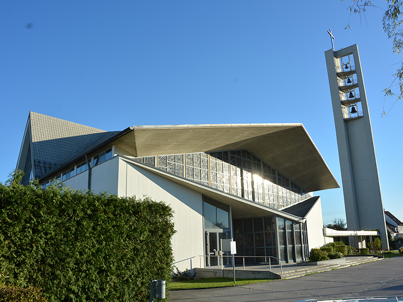 Bereits 1954 waren es 1500 Katholik:innen, die hier eine neue Heimat gefunden haben. Daher wurde der Bau einer eigenen Kirche beschlossen und schon im Jahr 1956 der Pfarrsaal als Notkirche eingeweiht.