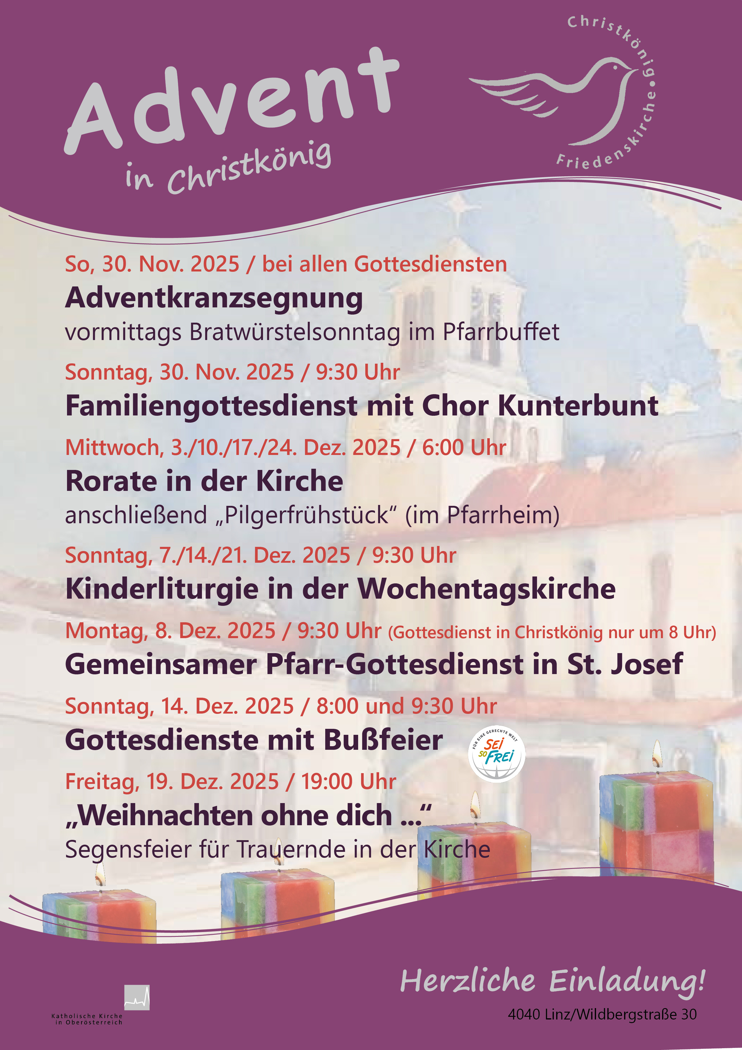 Hier finden Sie eine Übersichtübder die besonderen liturgischen Feiern im Advent in Christkönig!