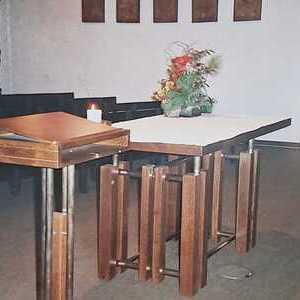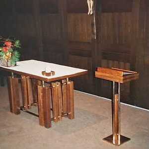 Altar und Ambo der Wochentagskapelle, die 1996 dem Stil der Kirche entsprechend von Othmar Kainz entworfen wurden, sind bewusst beweglich gestaltet und unterstützen so die Vielseitigkeit des Konzepts. Ihre freie Positionierung erlaubt eine situationsbezogene Nutzung.