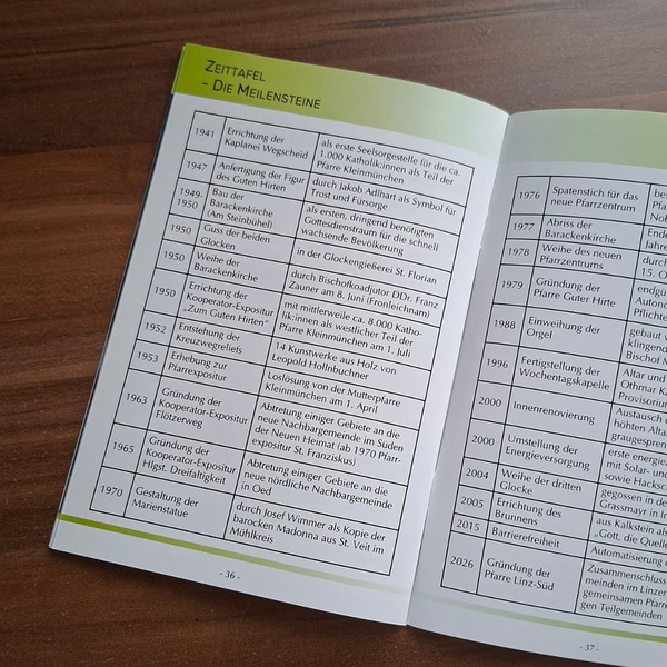 | 1950 | Errichtung der Kooperator-Expositur „Zum Guten Hirten“ | mit mittlerweile ca. 8.000 Katholik:innen als westlicher Teil der Pfarre Kleinmünchen am 1. Juli |