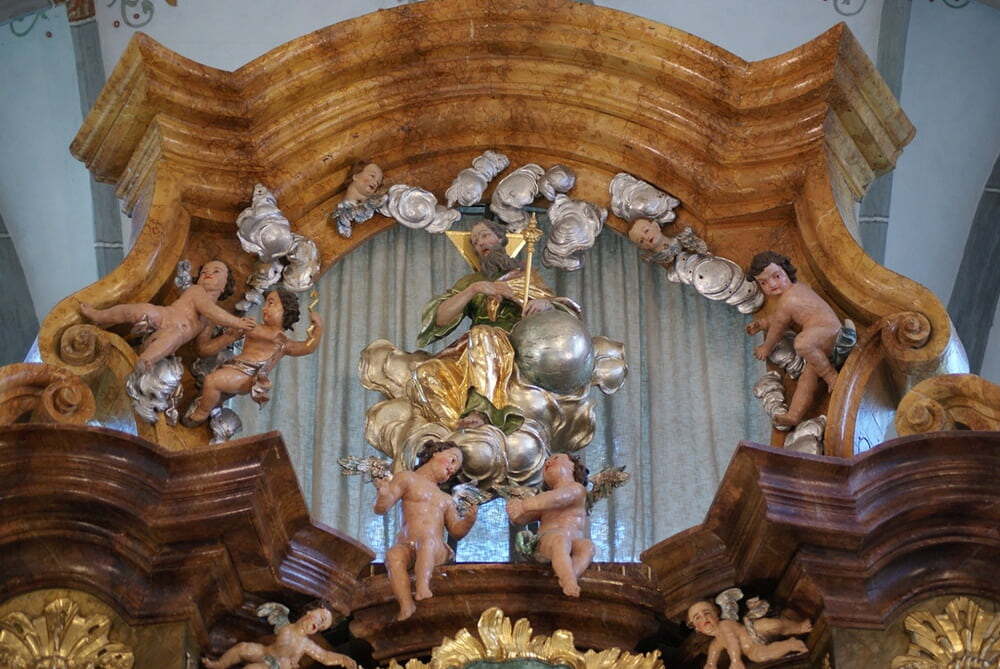 Von den drei Toren gelangt man jeweils zu den drei Altären. Jedem Altar ist eine Orgel auf der Empore über den Eingang zugeordnet, zu Ehren Gottes des Vaters, des Sohnes und des Hl. Geistes. Der "Gott-Vater-Altar" hat als Thema die Schöpfungsgeschichte und die Tugend des Glaubens. Figuren versinnbildlichen die Tugend dahingehend, dass die ewige Wahrheit der Kirche alles Unglaubende entlarvt. Der "Gott-Sohn-Altar" zeigt die Erlösung und die Tugend der Hoffnung. Durch die Auferstehung Jesu Christi wird uns Hoffnung geschenkt. Das Altarbild zeigt den Leichnam Jesu, und im Zentrum des Altars befindet sich eine goldene Figur des Auferstandenen. Am "Heiligen-Geist-Altar" sind das Pfingstwunder und die Tugend der Liebe dargestellt. Das Altarbild zeigt Jesus in der Krippe. Es ist der Hl. Geist, der Leben schafft. Die Liebe wird dargestellt durch die "Liebe zur Mutter", die "Liebe zu Gott", die "Liebe zu den Nächsten" (Erntegaben) sowie die "Liebe zur Schöpfung".