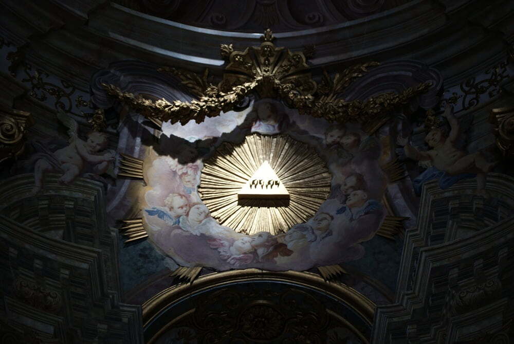 Die Kuppel zeigt eine reiche Schar an Heiligen, die der Dreifaltigkeit zujubeln. So sind wir als "pilgerndes Gottesvolk" ebenso berufen zur Heiligkeit. Der Weg in den Himmel führt uns über unser Handeln IN dieser Welt, sowie über die Zusage Gottes über unsere Aufnahme in den Himmel (unverdientes Geschenk Gottes = göttliche Gnade). Wir dürfen dieses Geschenk ohne Gegenleistung annehmen.