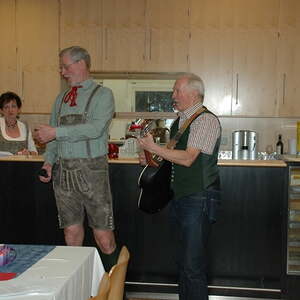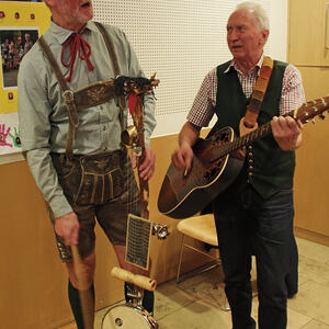 Später führte Pfarrer Christian noch ein weiteres Geburtstagsgeschenk vor: ein Trachtenoutfit mit Lederhose. Derartig passend gekleidet wurde er gleich in die Gruppe der Musikanten aufgenommen und begleitete auf der Teufelsgeige die nächsten Musikstücke.