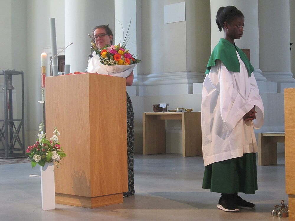 Die Kindergarten-Leiterin Gabi Rosenmayr stellte in der Kirche zwei neue Mitarbeiterinnen vor, Frau Tanja Hofmarcher (Pädagogin) und Frau Arnela Zigic (Helferin). Pfarrer Christian bedankte sich bei Pfarrsekretärin Klara Porsch, die mit 30. Juni 2019 ihren Dienst in unserer Pfarre beendete.
