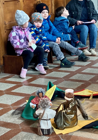 Im Rahmen der Familienmesse versammelte sich eine kleine Gruppe von Kindern und Erwachsenen zu einem Kindergottesdienst zum Thema „Jesus in der Stille“. Die Geschichte wurde anschaulich mit Figuren dargestellt: Jesus zieht sich in die Wüste zurück, um in der Stille nachzudenken, Kraft zu tanken und zu spüren, wer er ist und woher er kommt. In der Nacht unter den Sternen hört er in sein Herz hinein und spürt die Liebe Gottes, die ihm neue Kraft schenkt.
