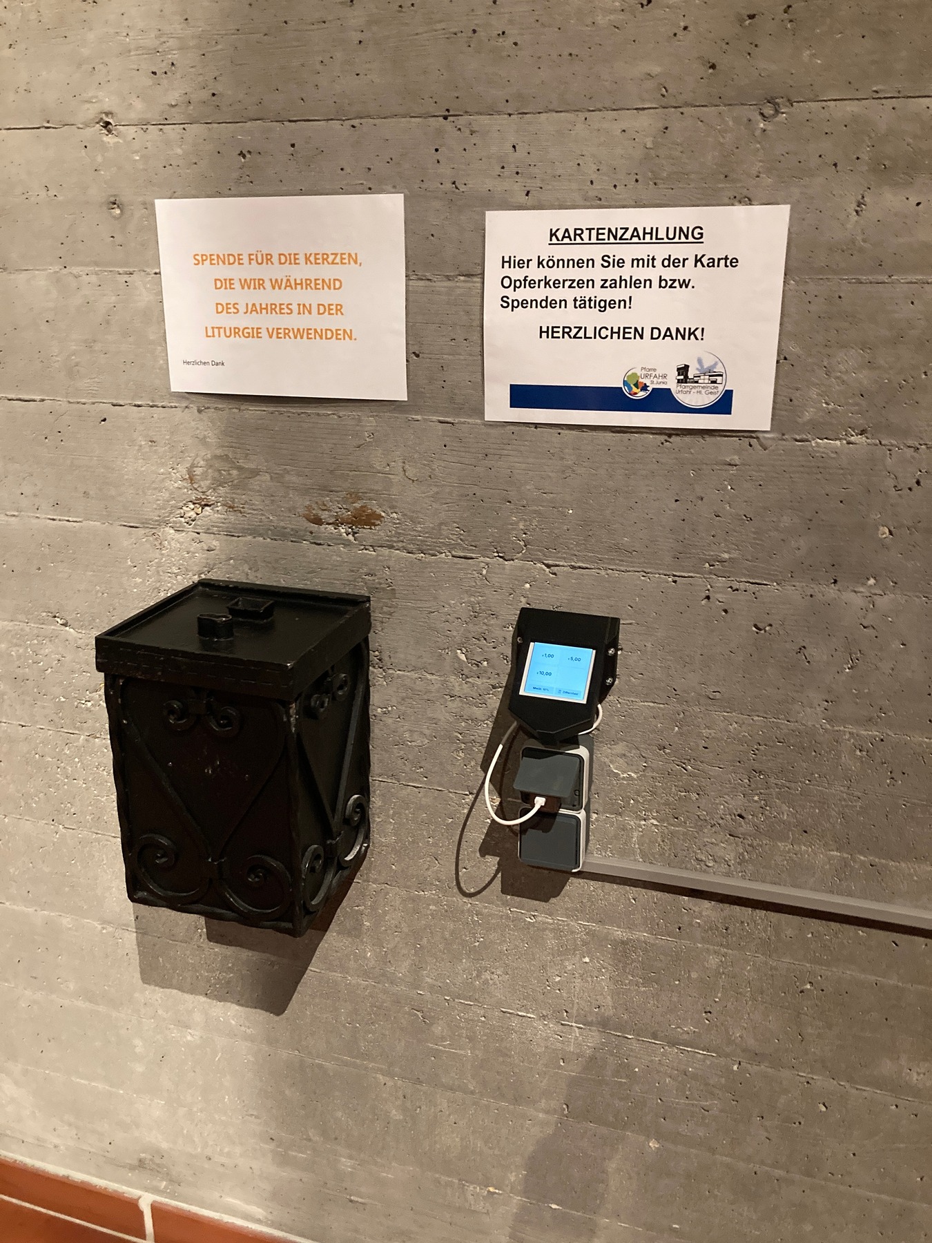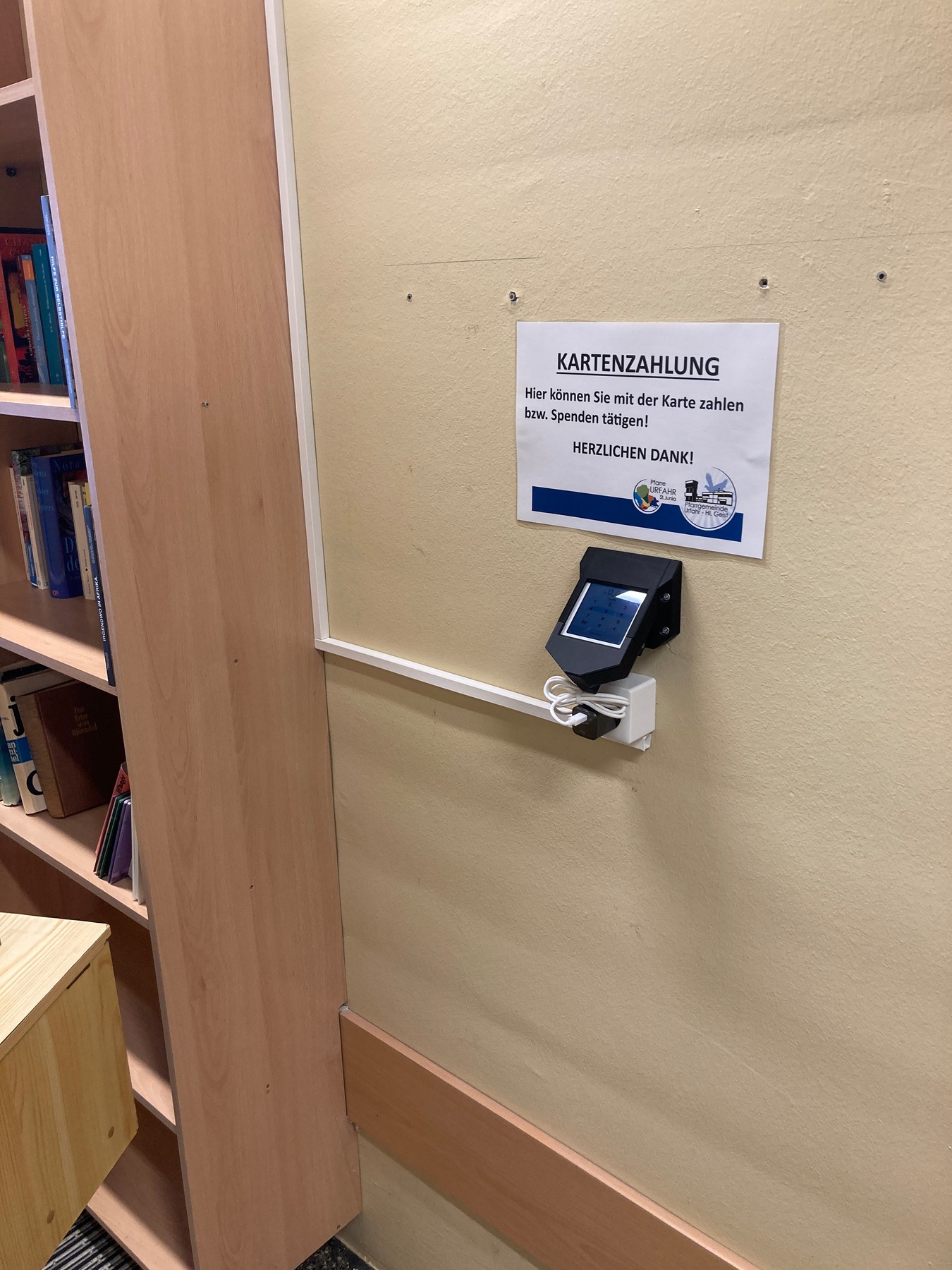 Und auch im Pfarrheim (bei Verkaufsaktionen wie Adventkränze, Palmbuschen, Flohmärkten,...) und im Pfarrbüro (Messstipendien, Raummiete,...) ist dies bereits möglich.