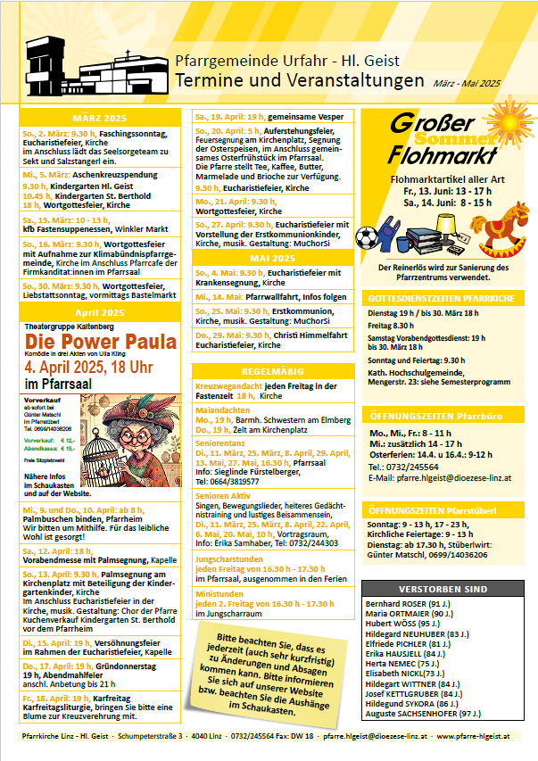 Großer Sommerflohmarkt & Junia Fest Freitag, 13.Juni 13 - 17 Uhr Samstag, 14.Juni 08 - 15 Uhr Sonntag, 15.Juni Großes Junia Pfarrfest (10h Gottesdienst, dann Frühschoppen)