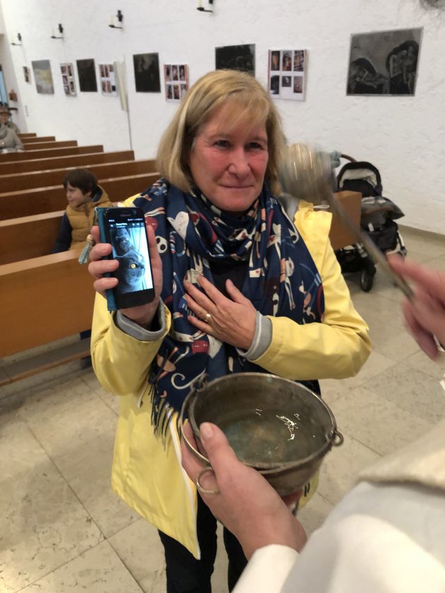Um die Tiere zu segnen lädt er in die Kirche St. Peter Tier mit Begleitung (Frauchen oder Herrl) ein. Wer nicht kommen kann hat ein Foto seines Tieres geschickt. Die Fotos wurden ebenfalls gesegnet.