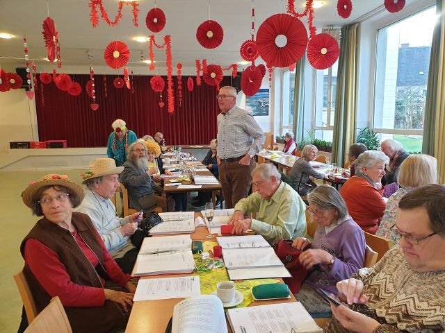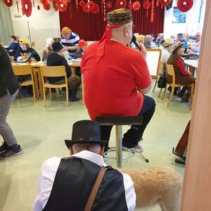 Faschingskostüme, Gewinnspiel, 1 Glas Sekt zum Empfang, Gratiskrapfen, gemeinsam Lieder singen, Pfarrer Franz Zeiger begleitet die SängerInnen mit seiner Gitarre, Witze werden erzählt, Schunkellieder zum Besten gegeben.