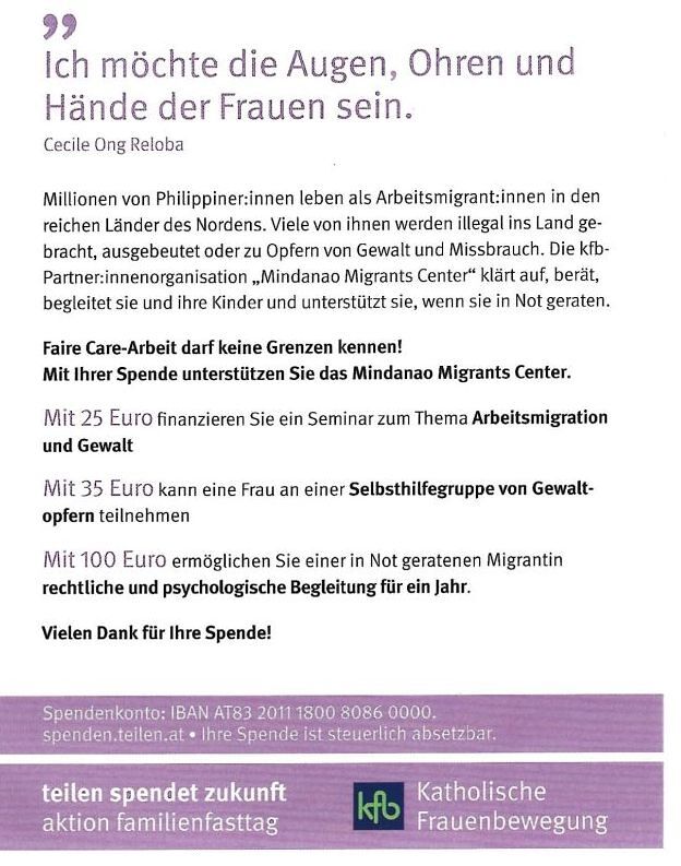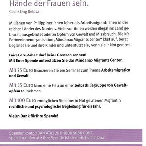 Das gespendete Geld verwendet die Katholische Frauenbewegung für Mädchen und Frauen auf den Philippinen oder für Mindano Migrants Center.