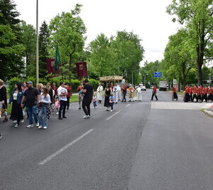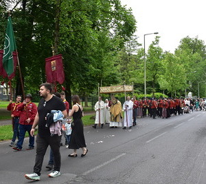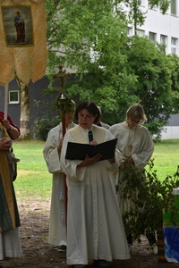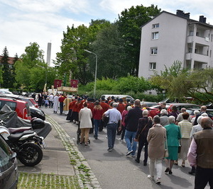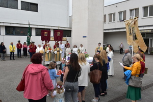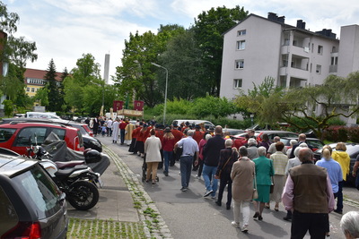 Nach der Eucharistiefeier in der Pfarrkirche St. Peter ging die Prozession durch die Straßen am Spallerhof. Den Abschluss bildete der Segen in alle Himmelsrichtungen beim 4. Altar am Kirchenplatz der Pfarre St. Peter.