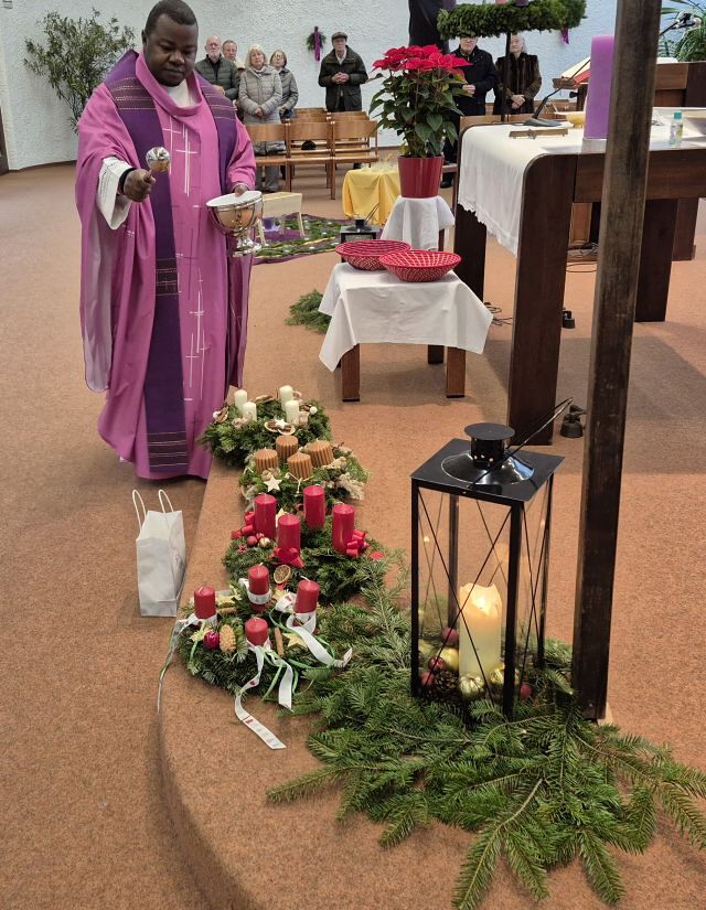 Während der Messe oben in der Kirche segnete Pfarrprovisor Lubega die Adventkränze.