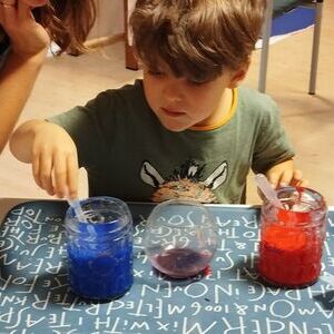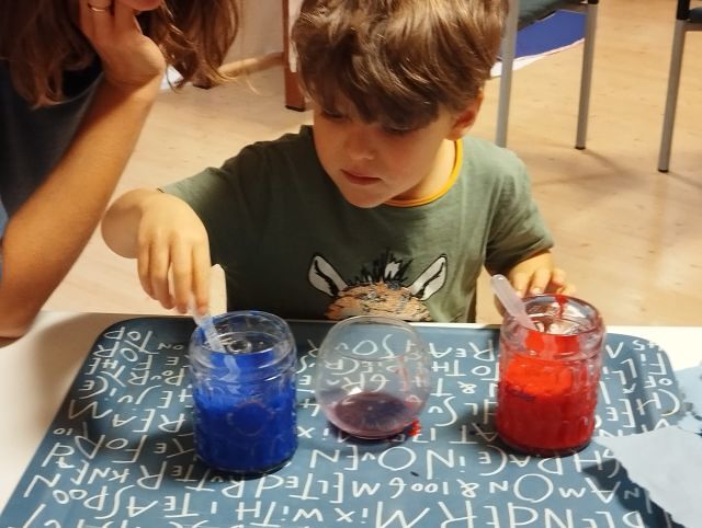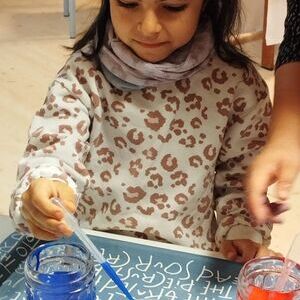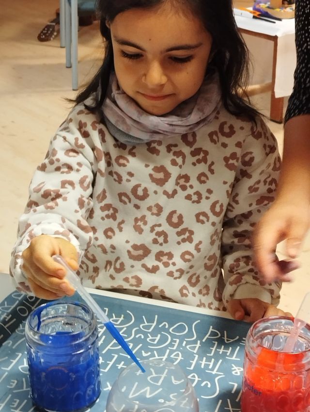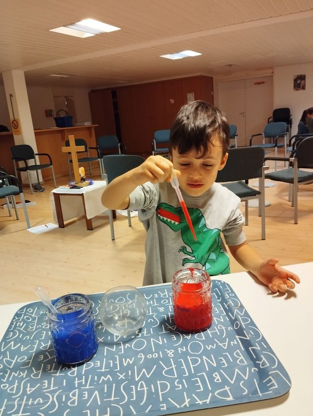 Am 1. Adventsonntag erfahren die Kinder, was es in der Adventzeit, die ja auch Fastenzeit ist, mit der Farbe Violett auf sich hat. Wenn man die Farbe Rot (Mensch / Leben) mit der Farbe Blau (Himmel / Gott) mischt, entsteht Violett. Das heißt, dass Gott sich in dieser Zeit zu den Menschen besonders hinwendet.