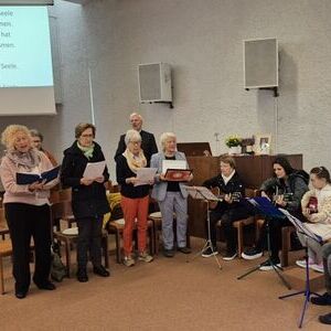 Die Singgruppe und die Gitarrespielerinnen tragen hörbar gut zur Messfeier bei.