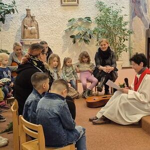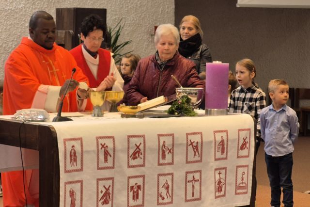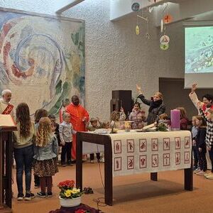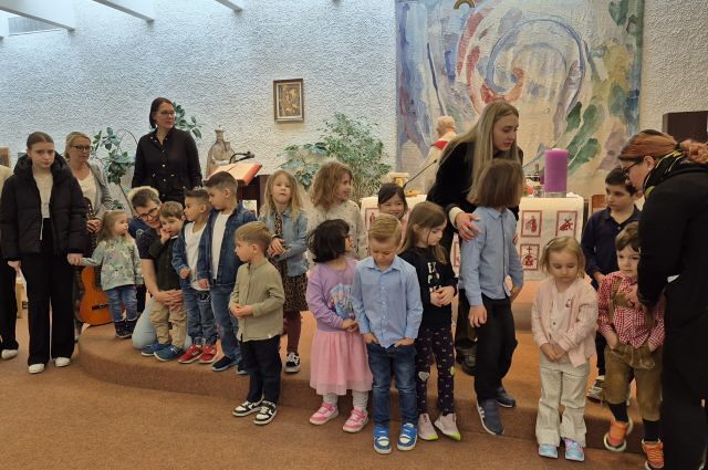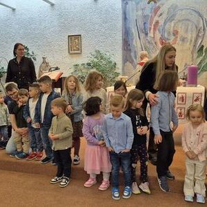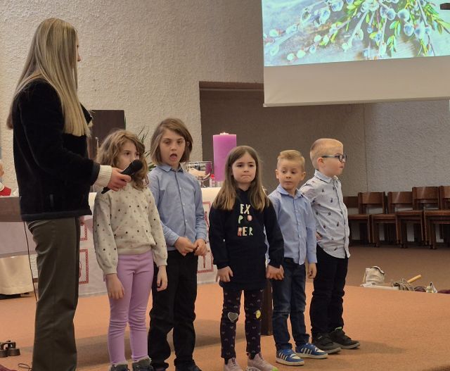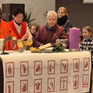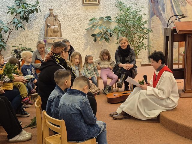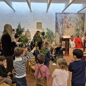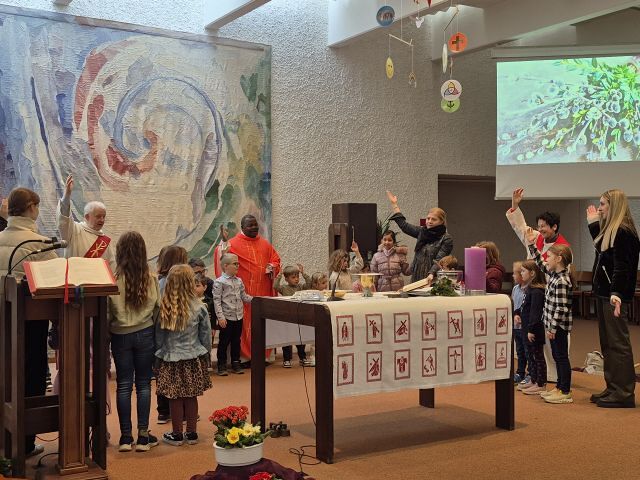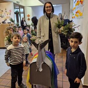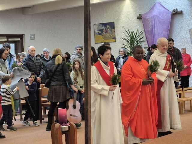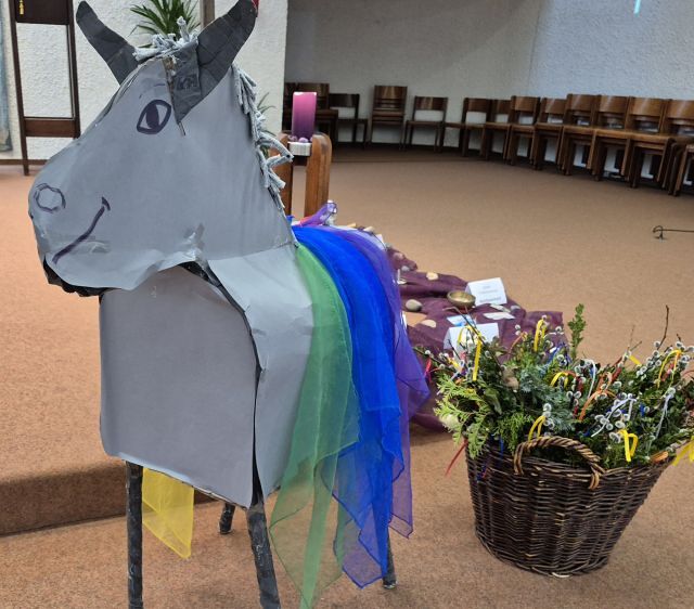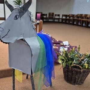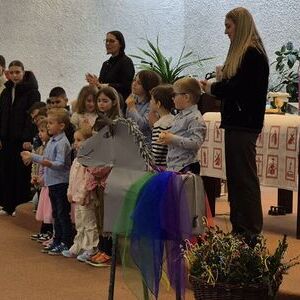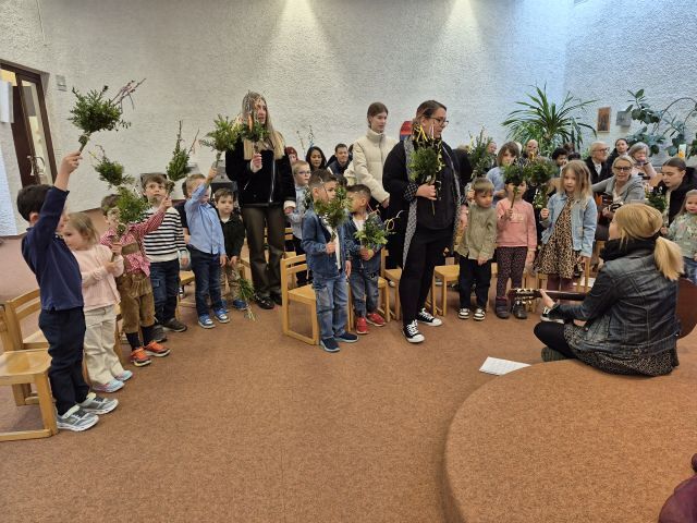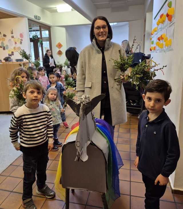Unter der Leitung von Sabine und ihrem Team zeigten uns die Kinder des Pfarr-Kindergartens, wie Jesus auf einer Eselin reitend, von vielen Menschen bejubelt, in Jerusalem eingezogen ist. Zu seiner Begrüßung wedelten die Menschen mit Palmzweigen.