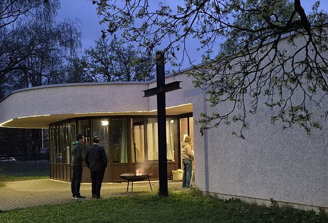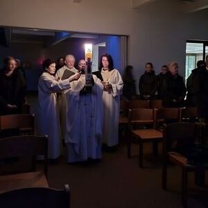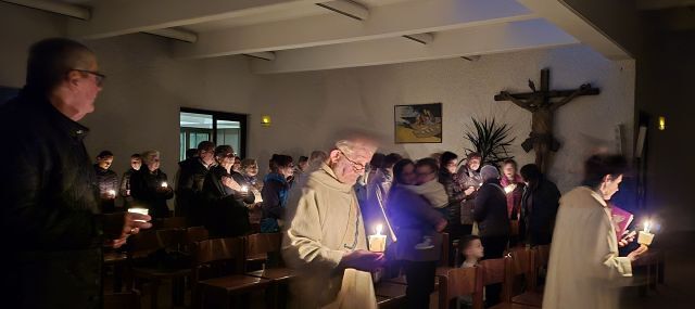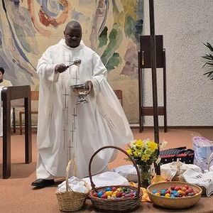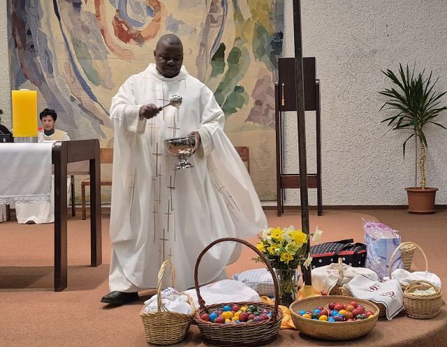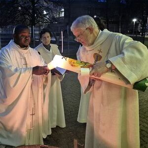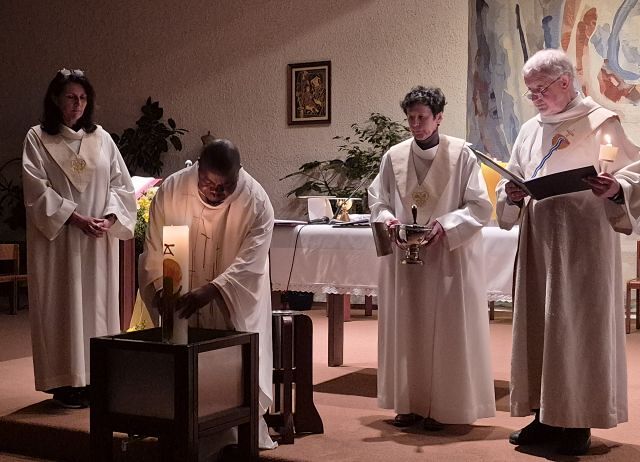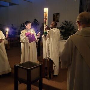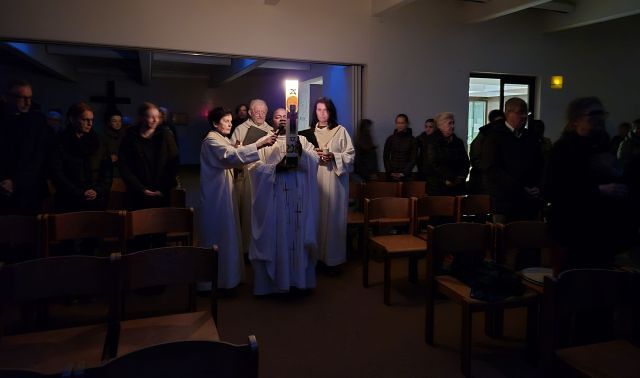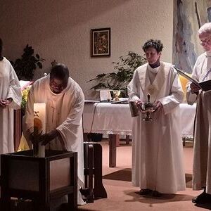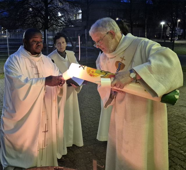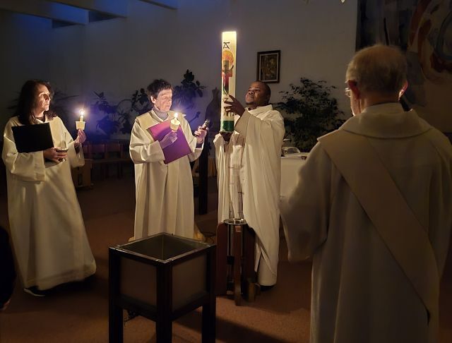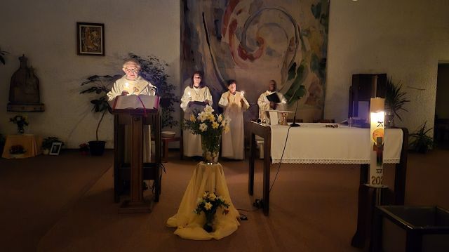 Das feierliche Hochamt beginnt mit dem Entzünden der Osterkerze/n und dem dreimaligen, wunderschönen Ruf "Lumen Christi" (das Licht Christi) auf den die Pfarrgemeinde "Deo gratias" (Dank sei Gott) antwortet.