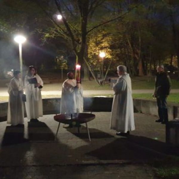 Ostersonntag 2022 - Auferstehungsfeier Trotz des kühlen Morgens waren viele Gläubige bei der Auferstehungsfeier (um 5h morgens) vor und dann in der Kirche versammelt Kaplan Michael Lubega nahm die Segnung der Osterkerze vor. zu den Bildern: Ostersonntag 2022 - Auferstehungsfeier