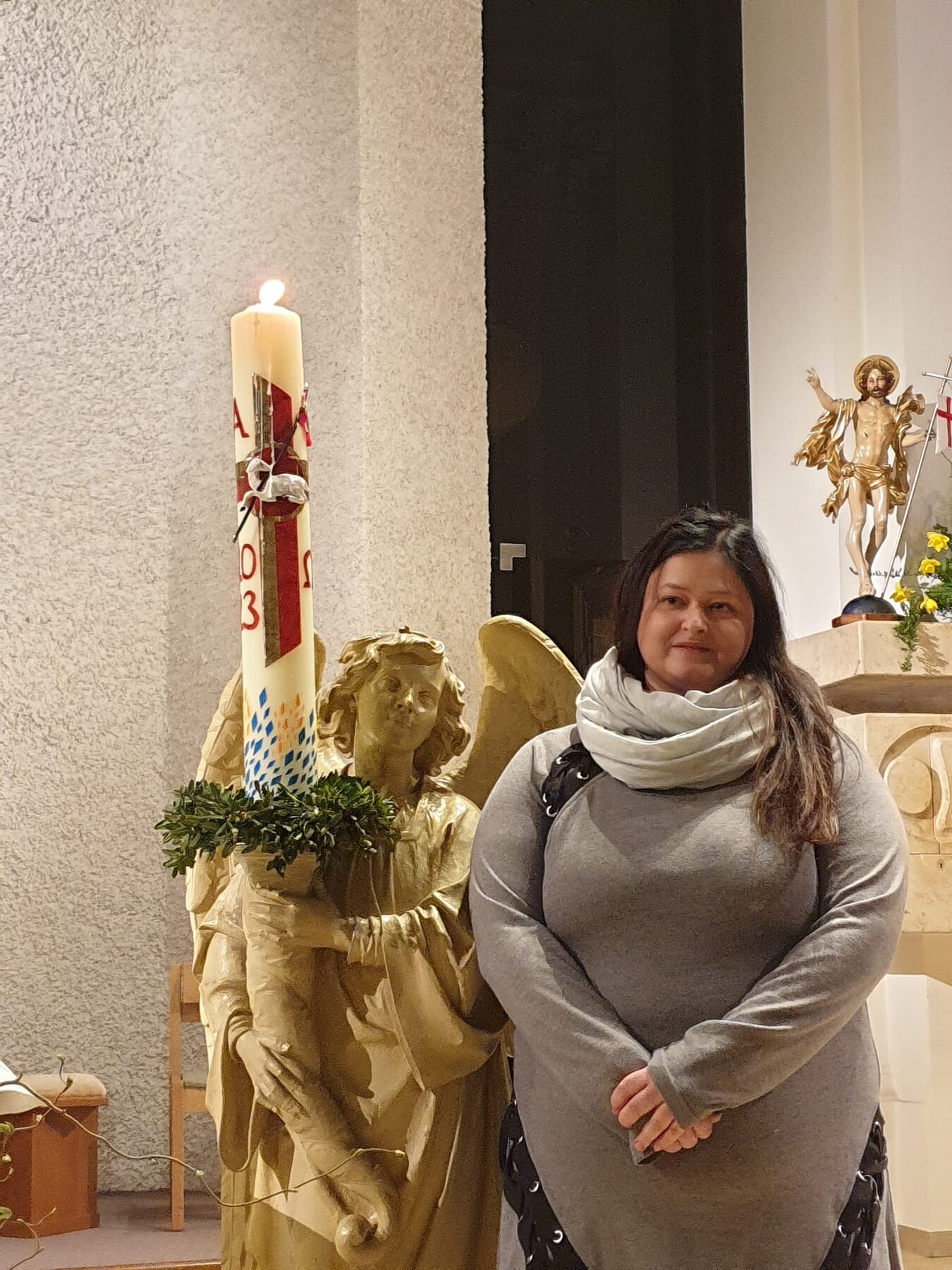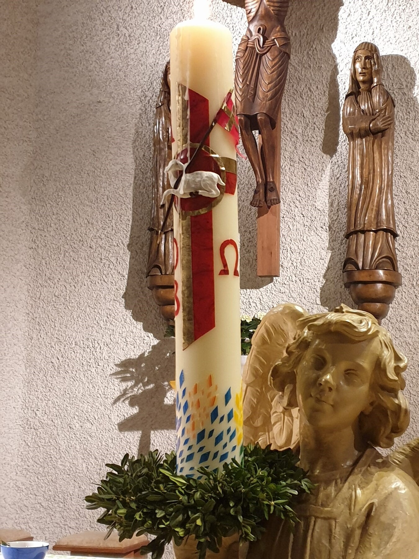 Wegen der empfindlichen dreidimensionalen Ausführung der Kerze mussten wir beim Transport zur Kirche und der Aufbewahrung in der Sakristei sehr vorsichtig sein, damit bis zu ihrer Entzündung in der Osternacht und dem Aufstellen am Altar die Kerze unversehrt blieb.