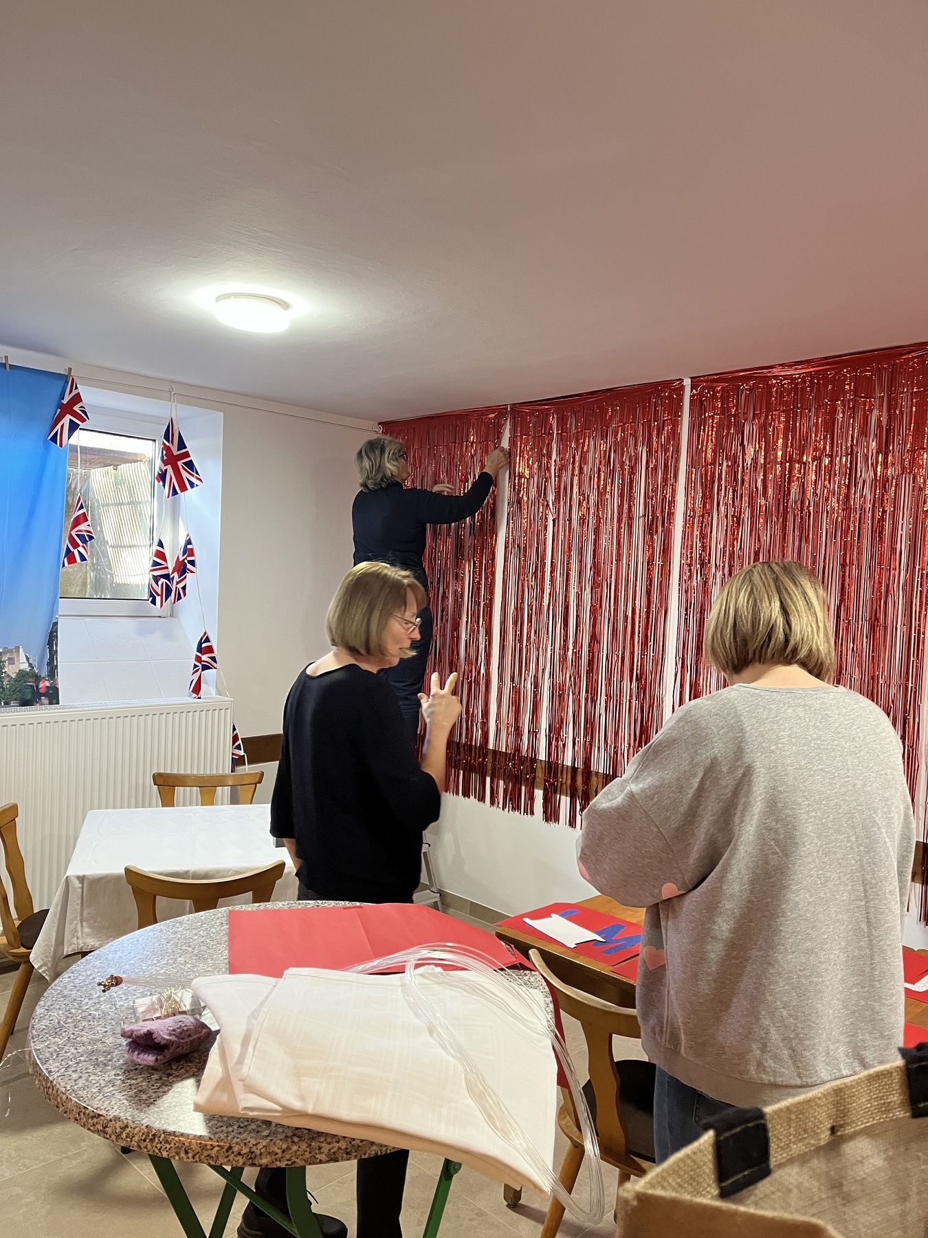 Viele fleißige Hände sind notwendig, um das Pfarrheim in einen Ballsaal zu verwandeln, um Wände zu dekorieren, um Tische und Sessel zu stellen, ...