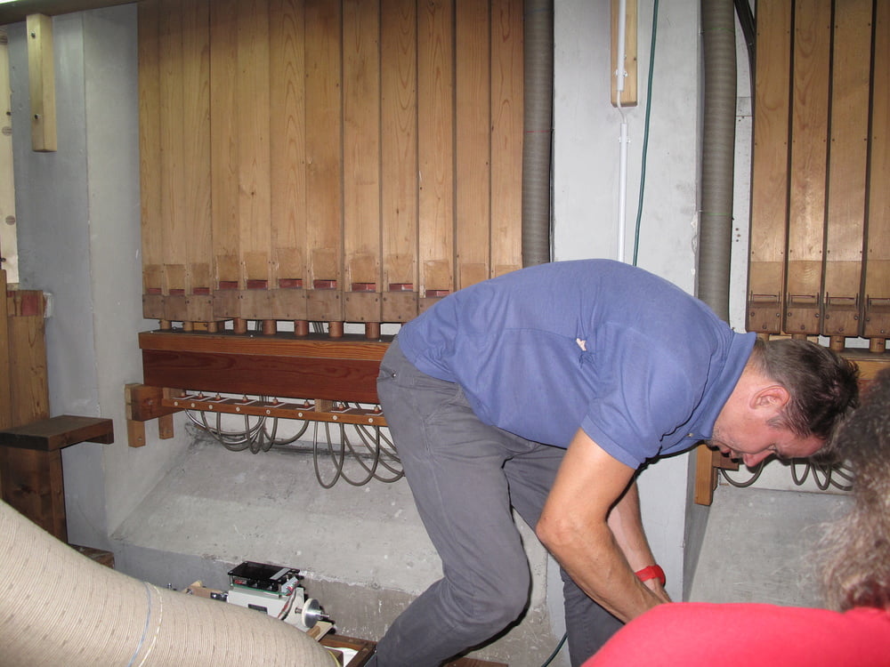 ... und dem Einlassen des Gehäuses wollen auch die Pfeifen nach dem rundieren und richten wieder den gewohnten Platz einnehmen. So einfach ist es nicht, es muss intoniert und vorgestimmt werden. Manch akrobatischer Akt ist notwendig um die Pfeifen zu erreichen. Sowohl Zungen- und Labialpfeifen ließen sich 2 mal bitten um den richtigen Klang zu erzeugen!