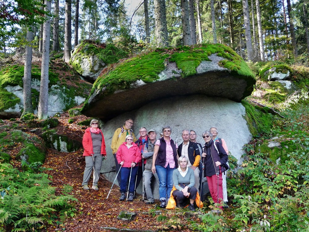 Die heurige Wanderung des Männerstammtisches hat bei durchwegs gutem Wetter in Bad Leonfelden zum Sternstein und Pilzstein geführt. Diese beiden Bergrücken mit knapp über 1000 Höhenmeter liegen in einer der ältesten geologischen Formation Europas, dem Böhmischen Massiv, das vor rund 300 Mio Jahren im Erdaltertum entstanden ist. Ein besonderes Phänomen in diesem alten Gebirgszug sind die an etlichen Stellen anzutreffenden „Wollsackbildungen und Blockhalden“. Es sind dies durch Erosion und Frostverwitterung insbesondere im Gipfelbereichen freigelegte, tonnenschwere Granit- und Gneis-Gesteinsblöcke, die völlig unregelmäßig wie Kissen, Matrazen und Wollsäcke über/unter- oder nebeneinander lagern. Aufgrund ihrer Form und Aussehen wurden einige dieser Gesteinsblöcke im Volksmund mit Namen wie „ Pilzstein“, „Teufelsbett“ oder „Christophorusstein“ versehen. Das verwitterte, kristalline Gestein ist wiederum die Basis für die Bildung der sauren und nährstoffarmen (aber Heidelbeer-reichen!) Böden im Mühl- und Waldviertel.