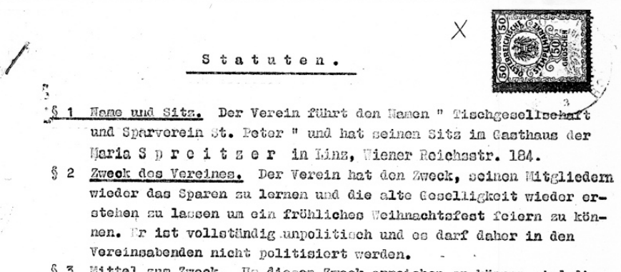 Die heisseste Spur führt in Richtung der Tischgemeinschaft St. Peter, einer der traditionsreichsten Gemeinschaften in Linz mit dem Ziel die Geselligkeit hoch zu halten wie in den noch im Original erhaltenen Vereinsstatuten nachgelesen werden kann.